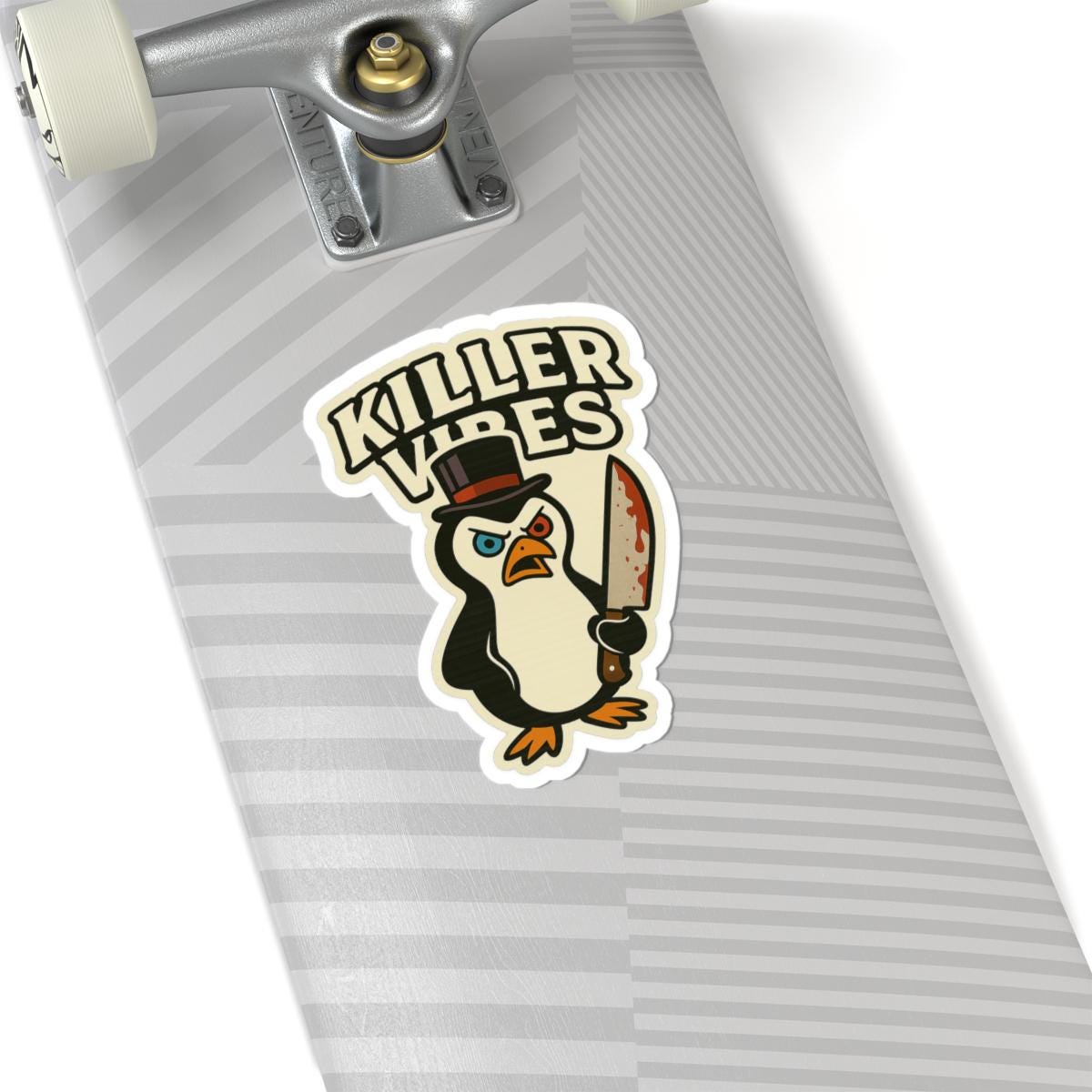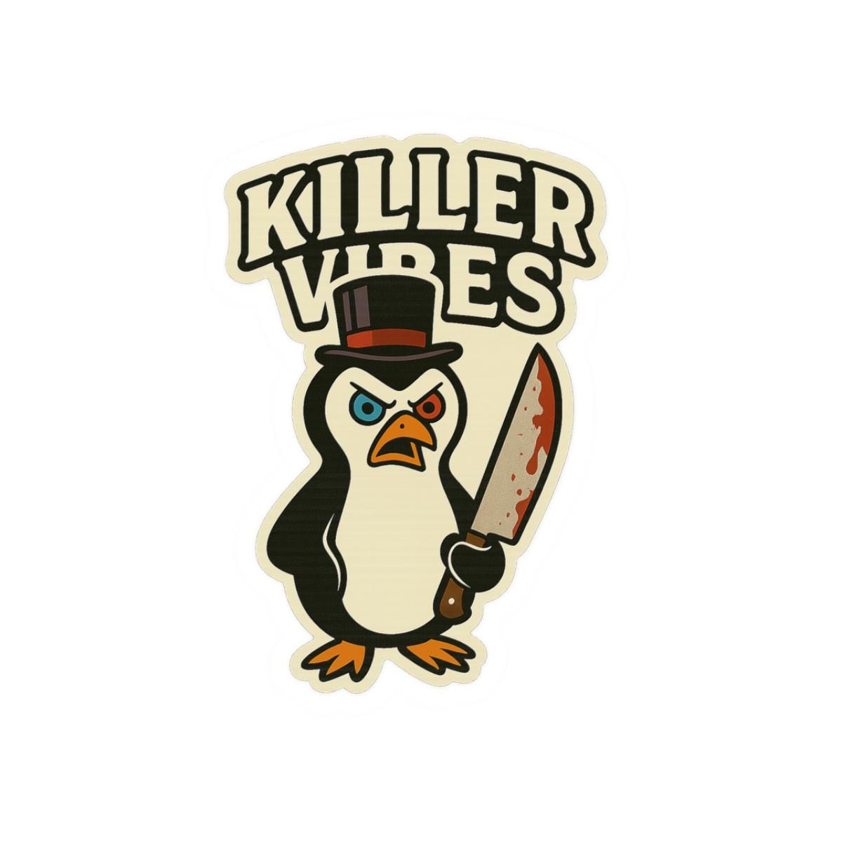 Add some killer attitude to your gear with this bold, horror-themed Killer Vibes kiss-cut sticker. Featuring a deranged penguin with a bloody blade and twisted grin, this design is perfect for laptops, journals, water bottles, or anywhere you want to show off your dark side with style.