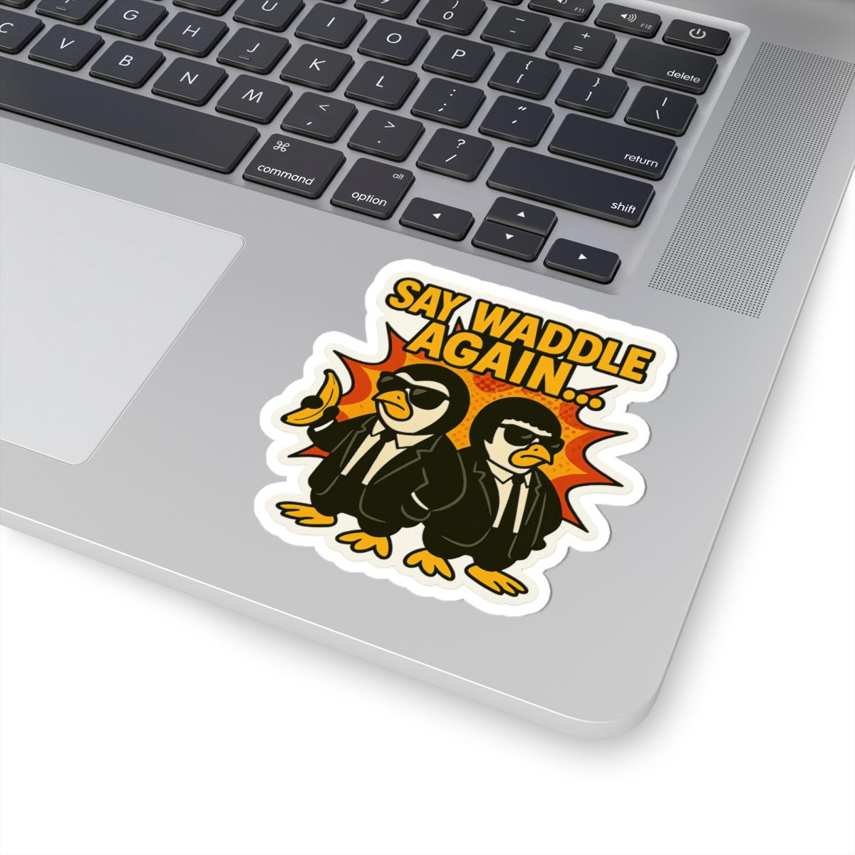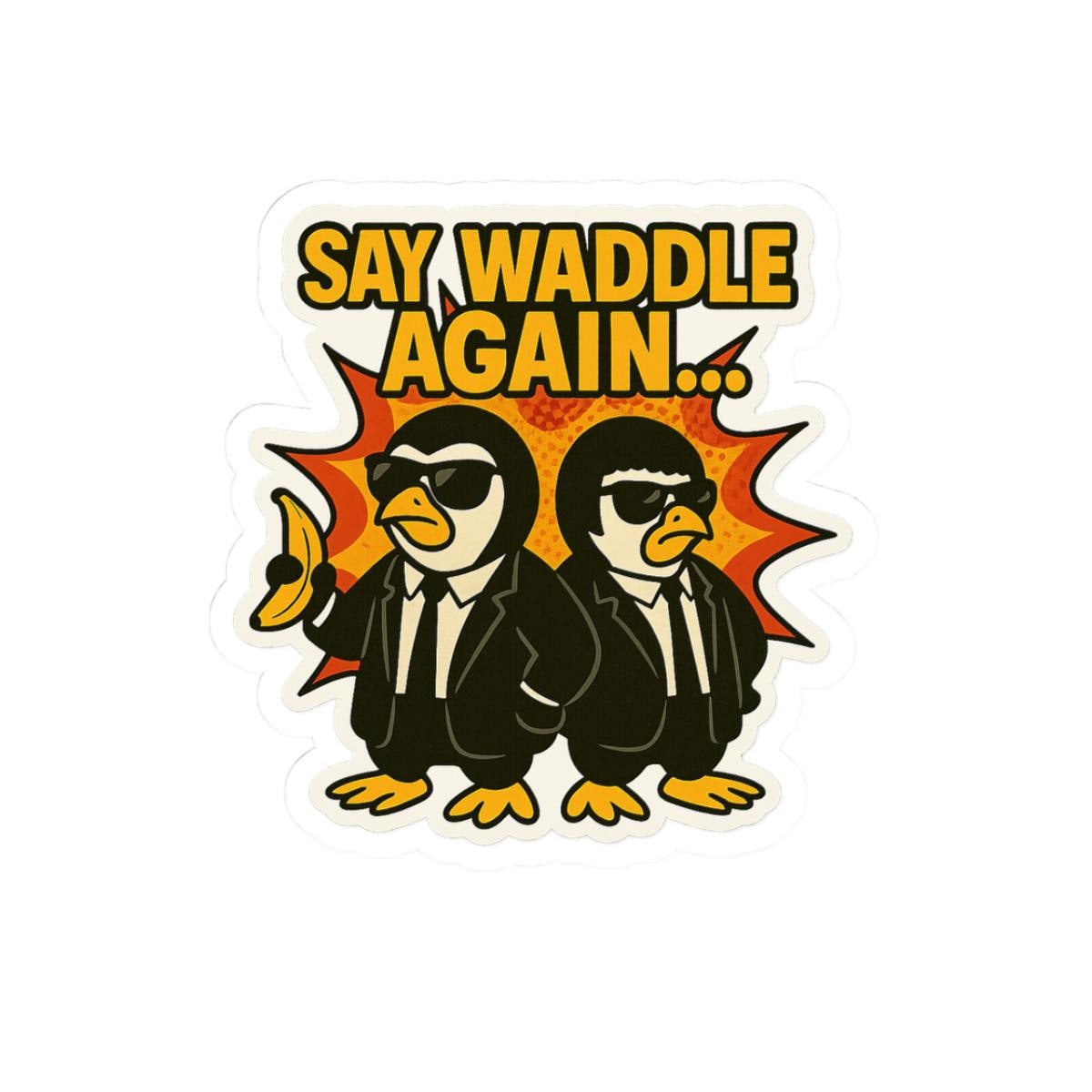 Bring a splash of quirky attitude to your laptop, notebook, water bottle, or workspace with our “Say Waddle Again” Kiss-Cut Sticker. This bold and funny design features two sharply dressed penguins in classic black suits and sunglasses—one confidently holding a banana like a total boss.