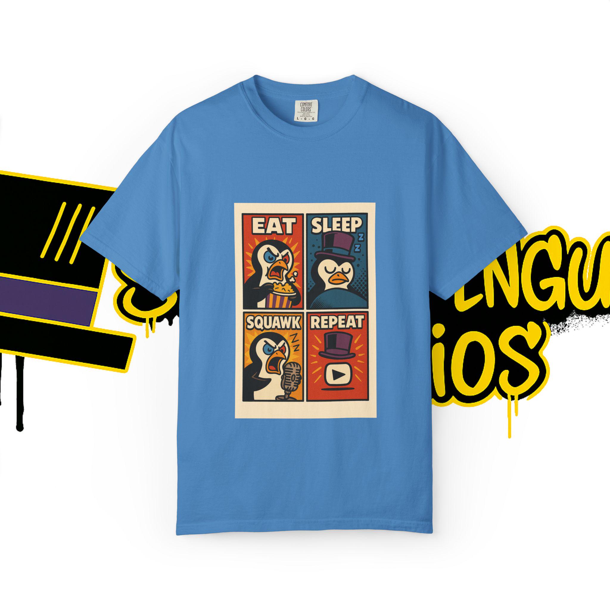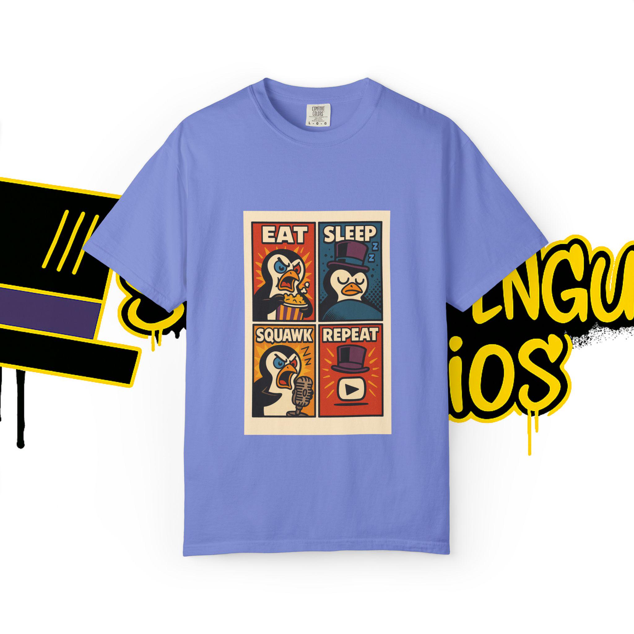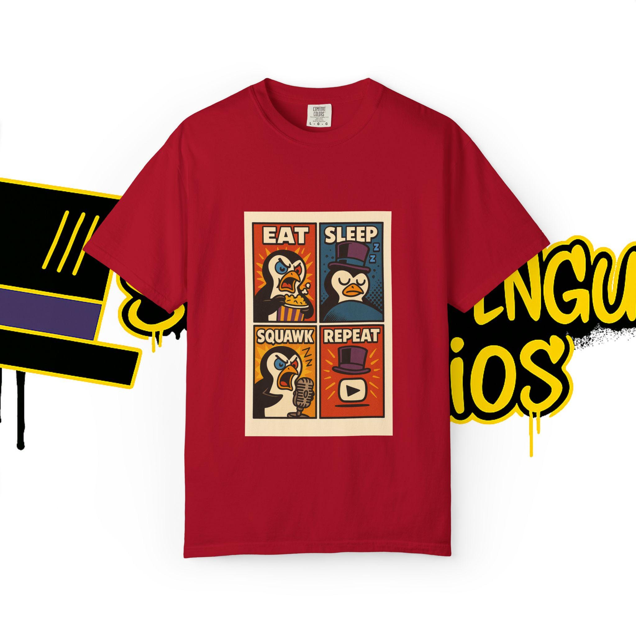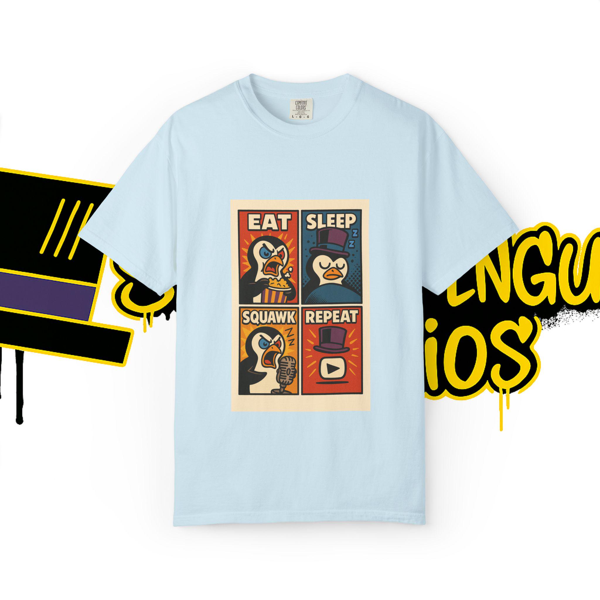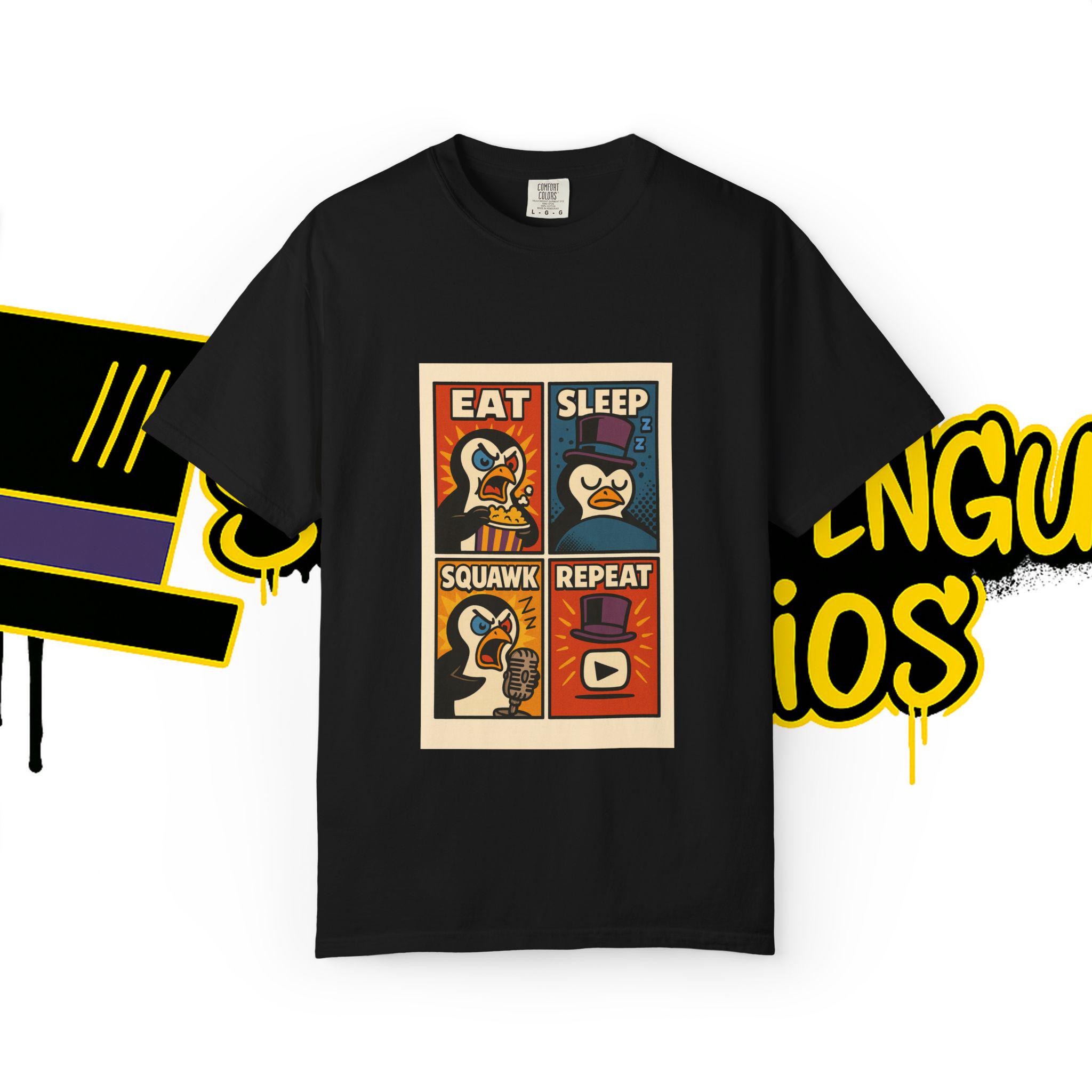 🎬 Live for the loop. With the **“Eat Sleep Squawk Repeat” Tee**, you get personality, humor, and penguin power — all in one vintage-soft garment. Perfect for movie lovers, podcasters, streamers, or anyone who appreciates the simple joys: eat, sleep, squawk, repeat.