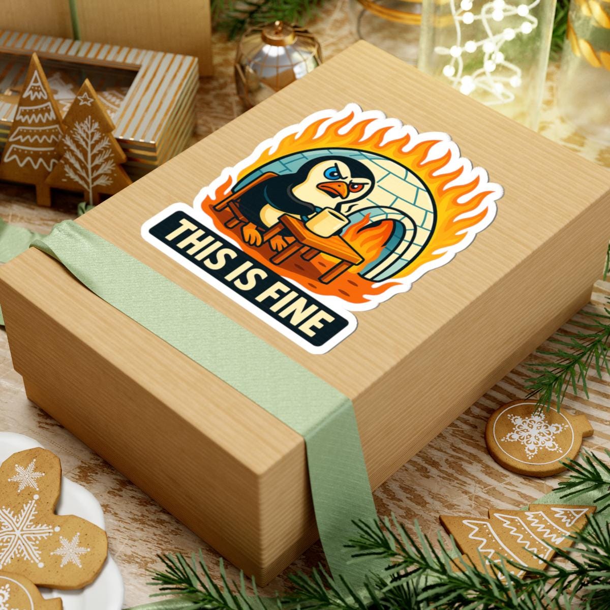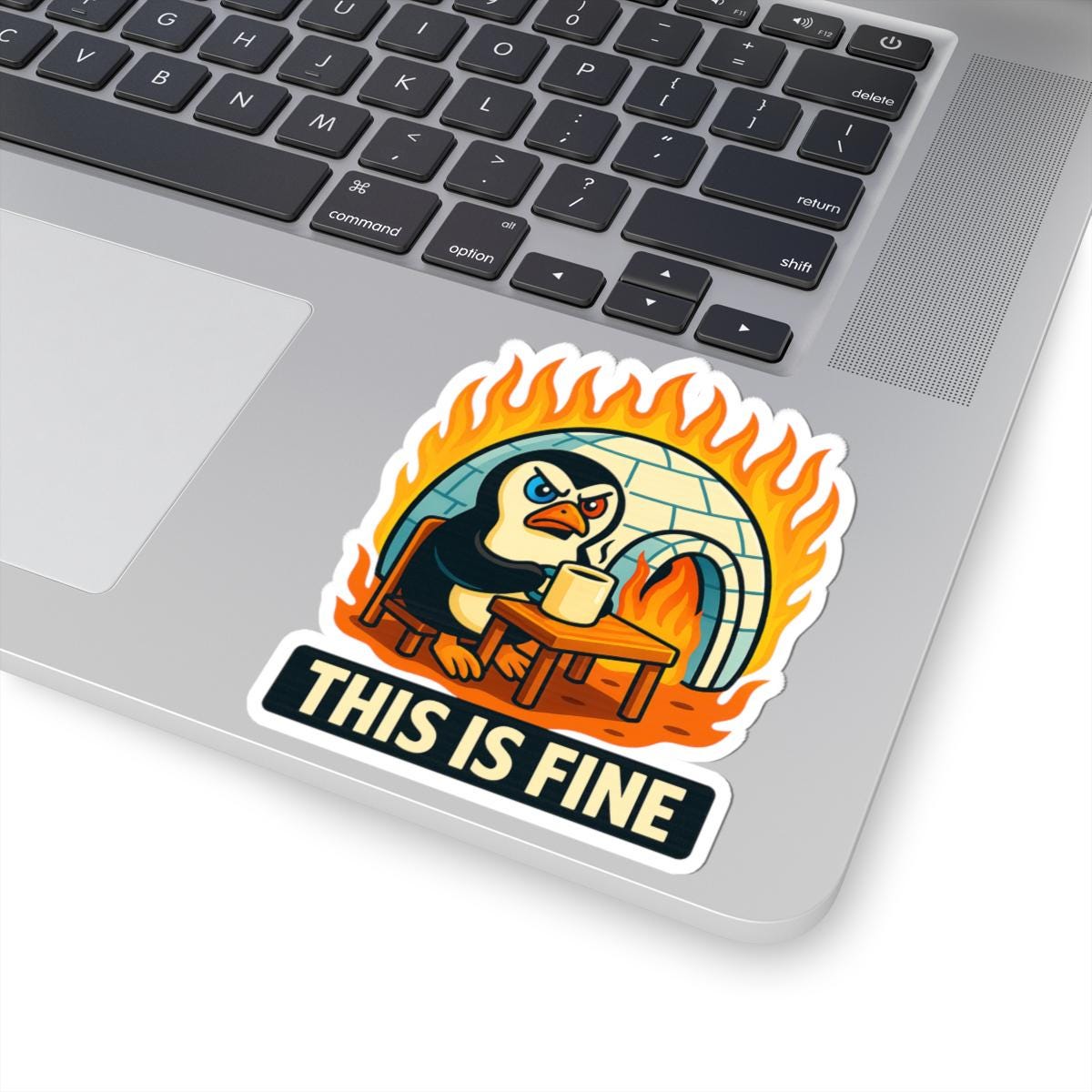 funny sticker, meme sticker, penguin sticker, laptop decal, kiss cut sticker, this is fine, sad penguin, vinyl sticker, sarcastic gift, office humor, trending sticker, waterproof decal, journal sticker, unique sticker, novelty gift, flaming igloo, chill chaos, sarcastic art, angry penguin, gift for friend