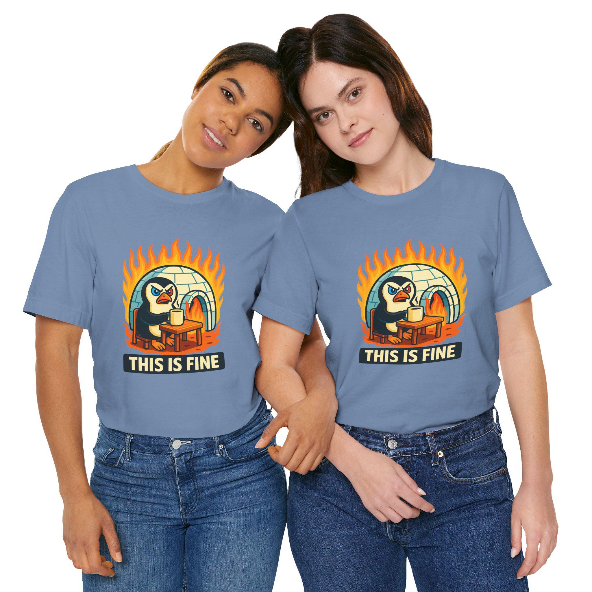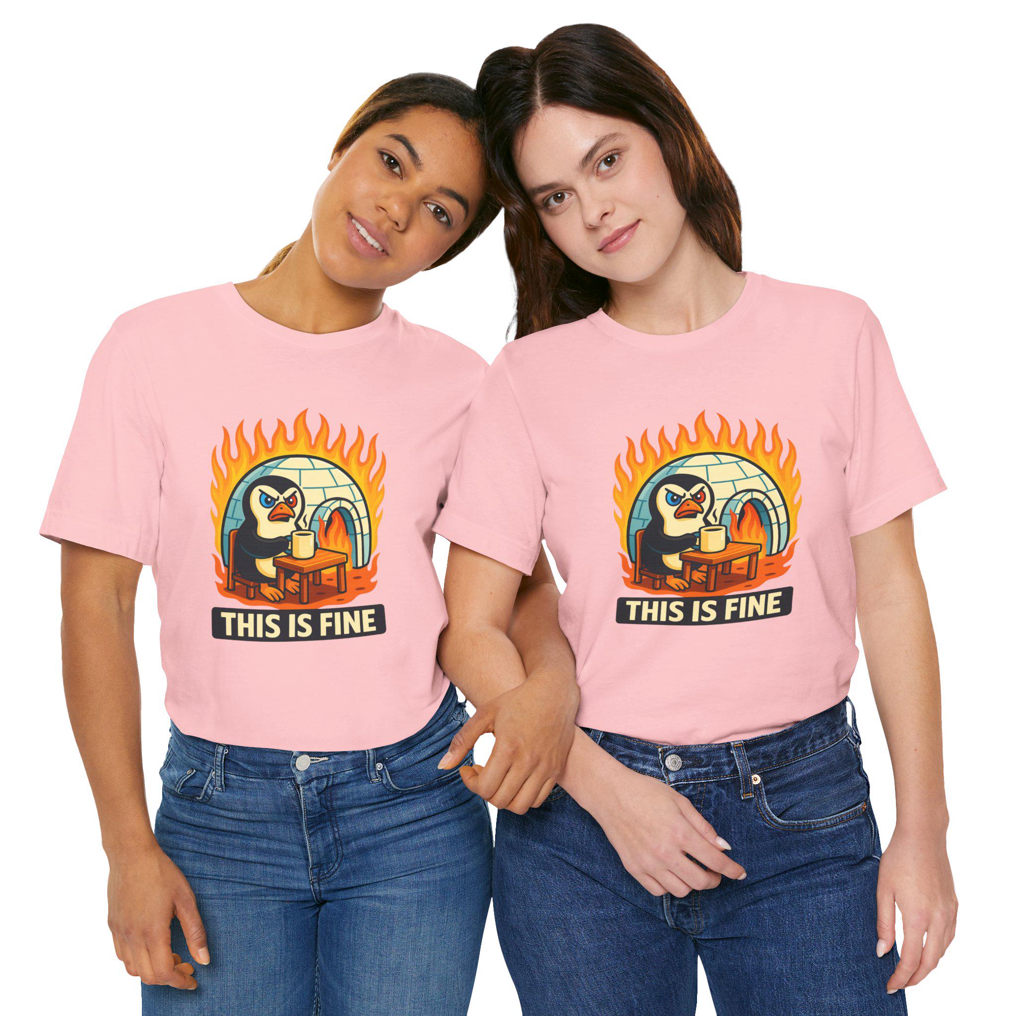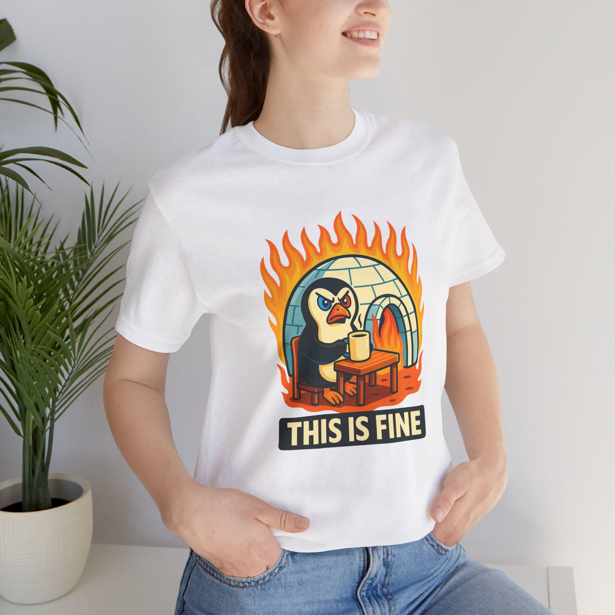 The front design features a retro-style penguin sitting calmly in a burning room, framed by stylized flames with the bold “THIS IS FINE” caption — the perfect joke for burnout moods, sarcastic mental health humor, or anyone who copes with chaos using memes. Easy to wear year-round, it’s great on its own or layered under hoodies and jackets for that curated, casual look.