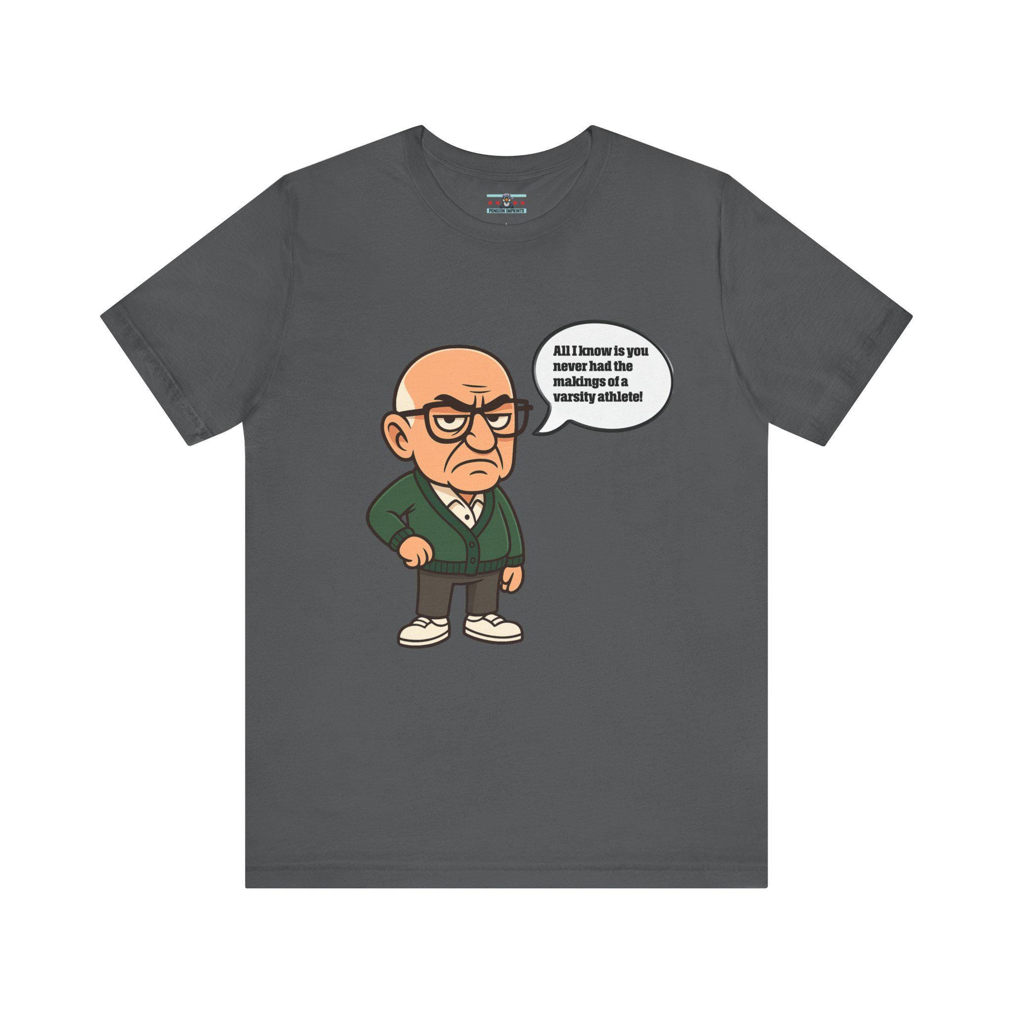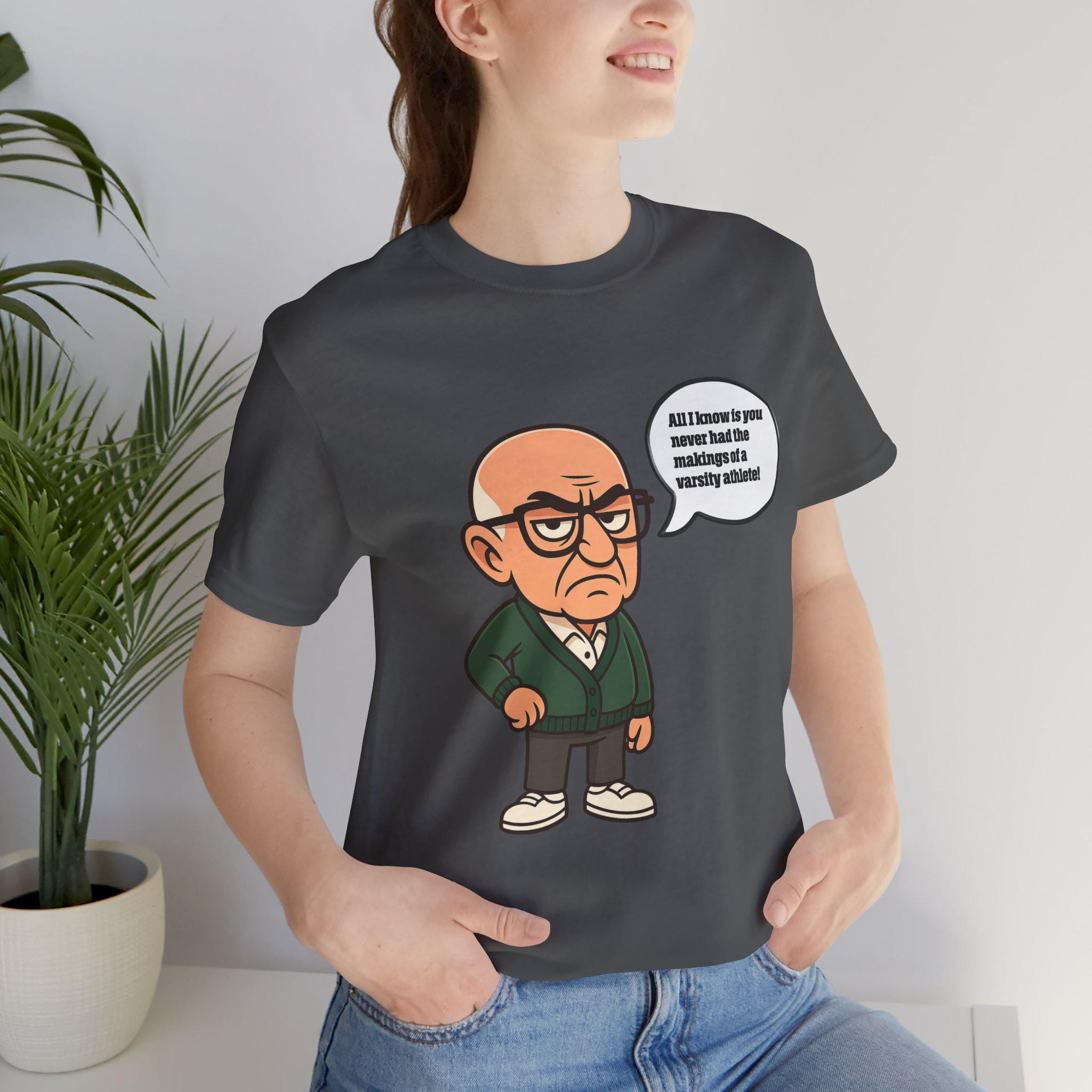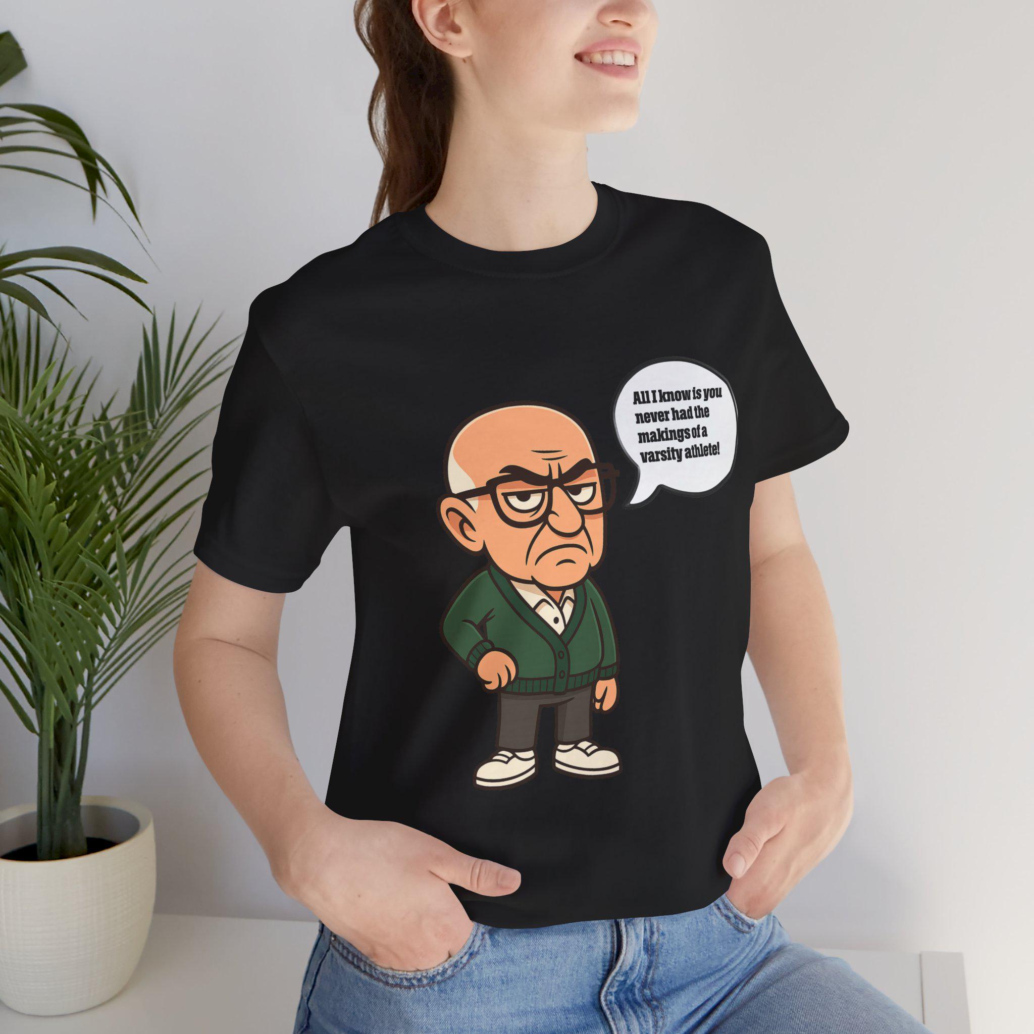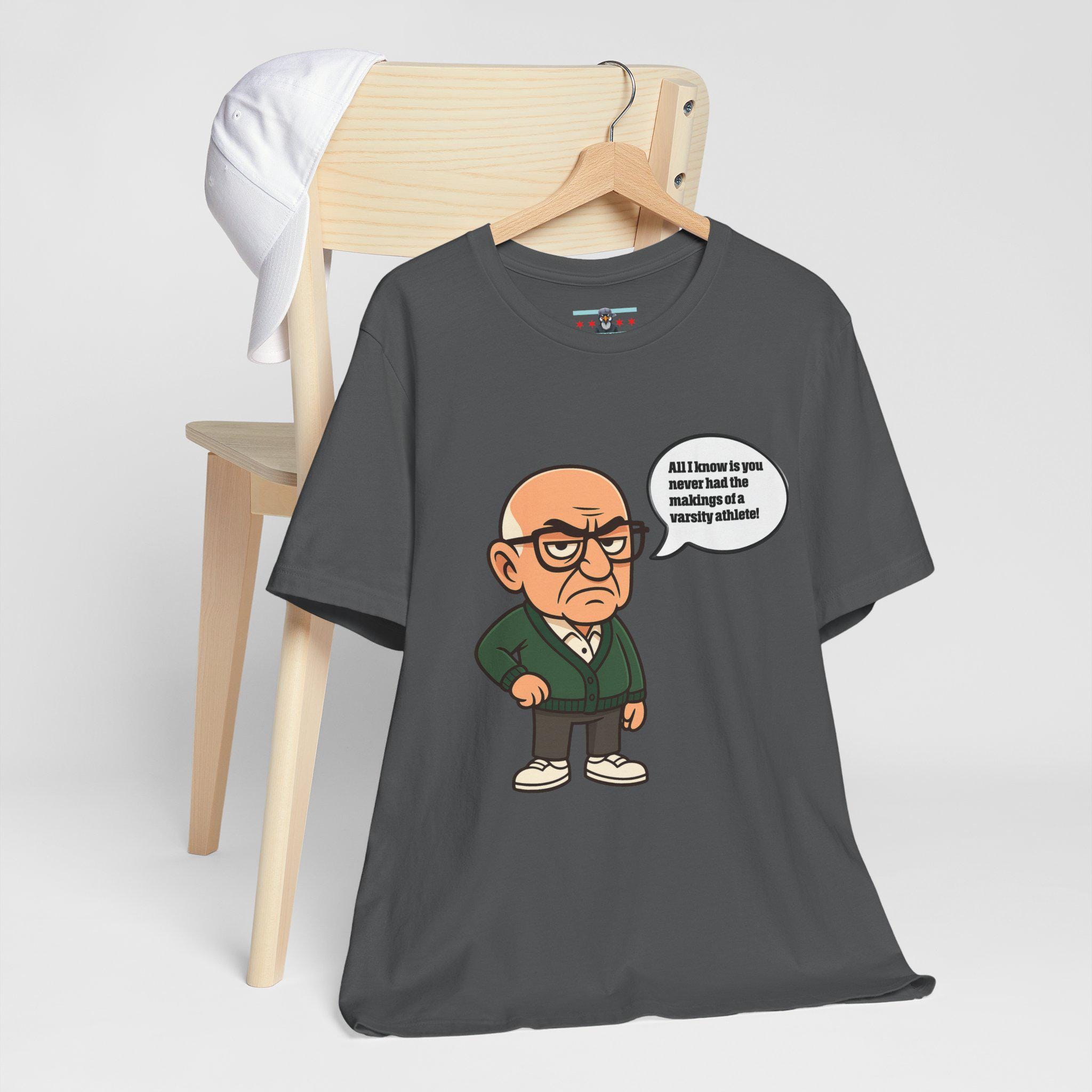 Bring some sharp, sarcastic humor to your wardrobe with this Funny Sopranos-inspired Varsity Athlete Caricature Tee. Featuring a bold big-head cartoon character delivering an unforgettable dry one-liner, this shirt is perfect for anyone who appreciates clever, deadpan comedy and retro mob-style parody art.