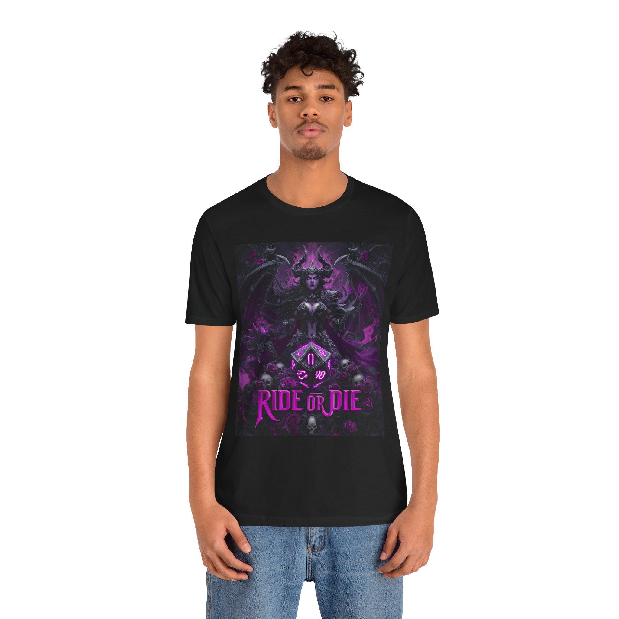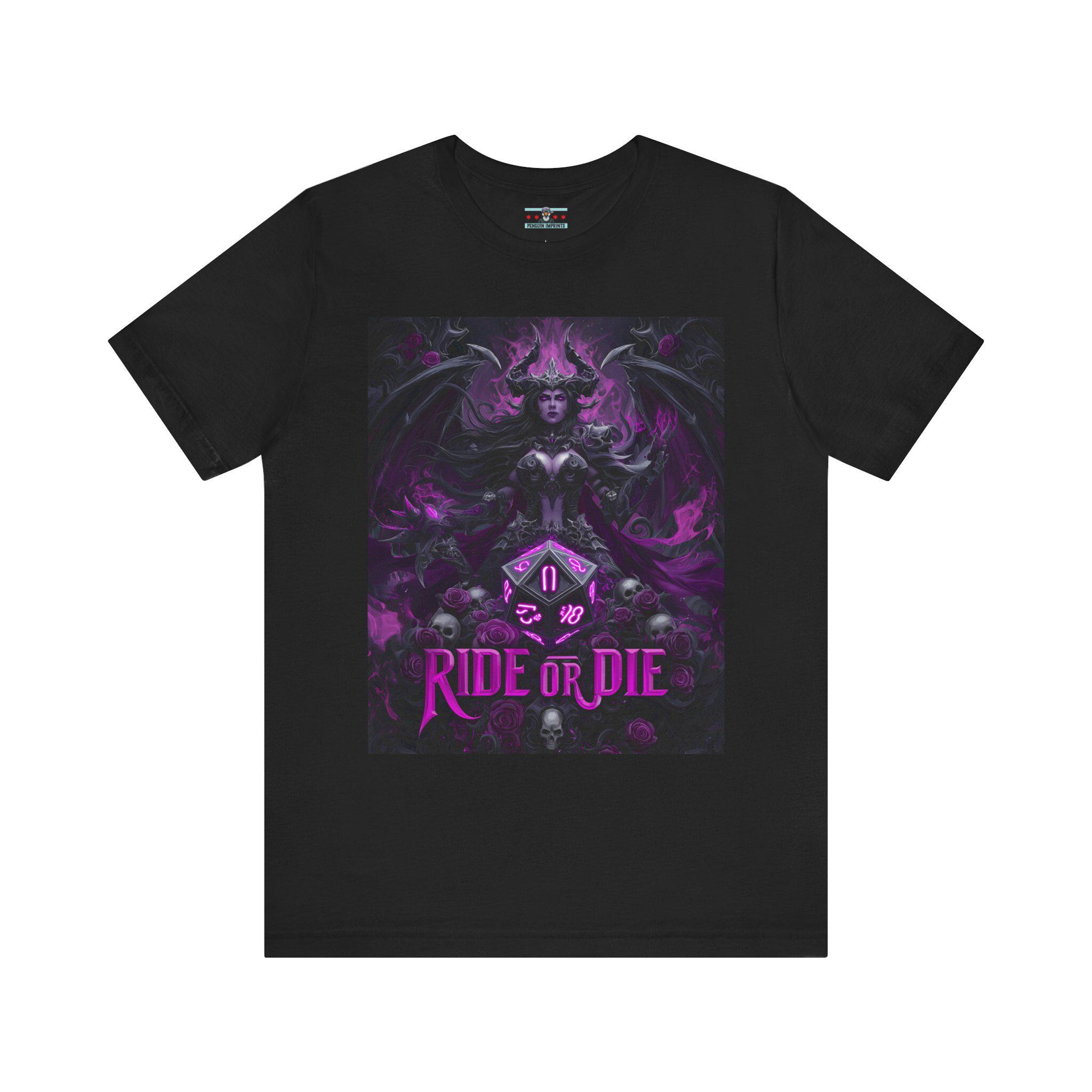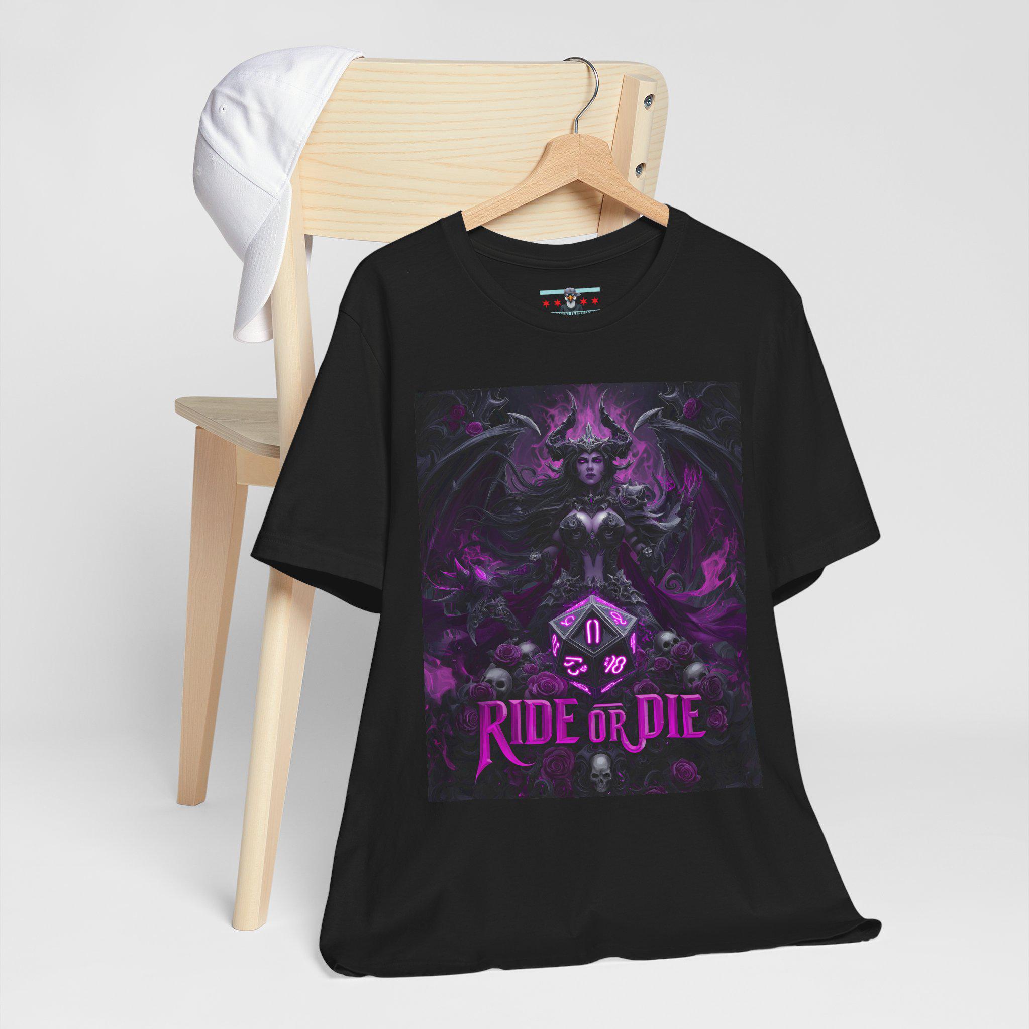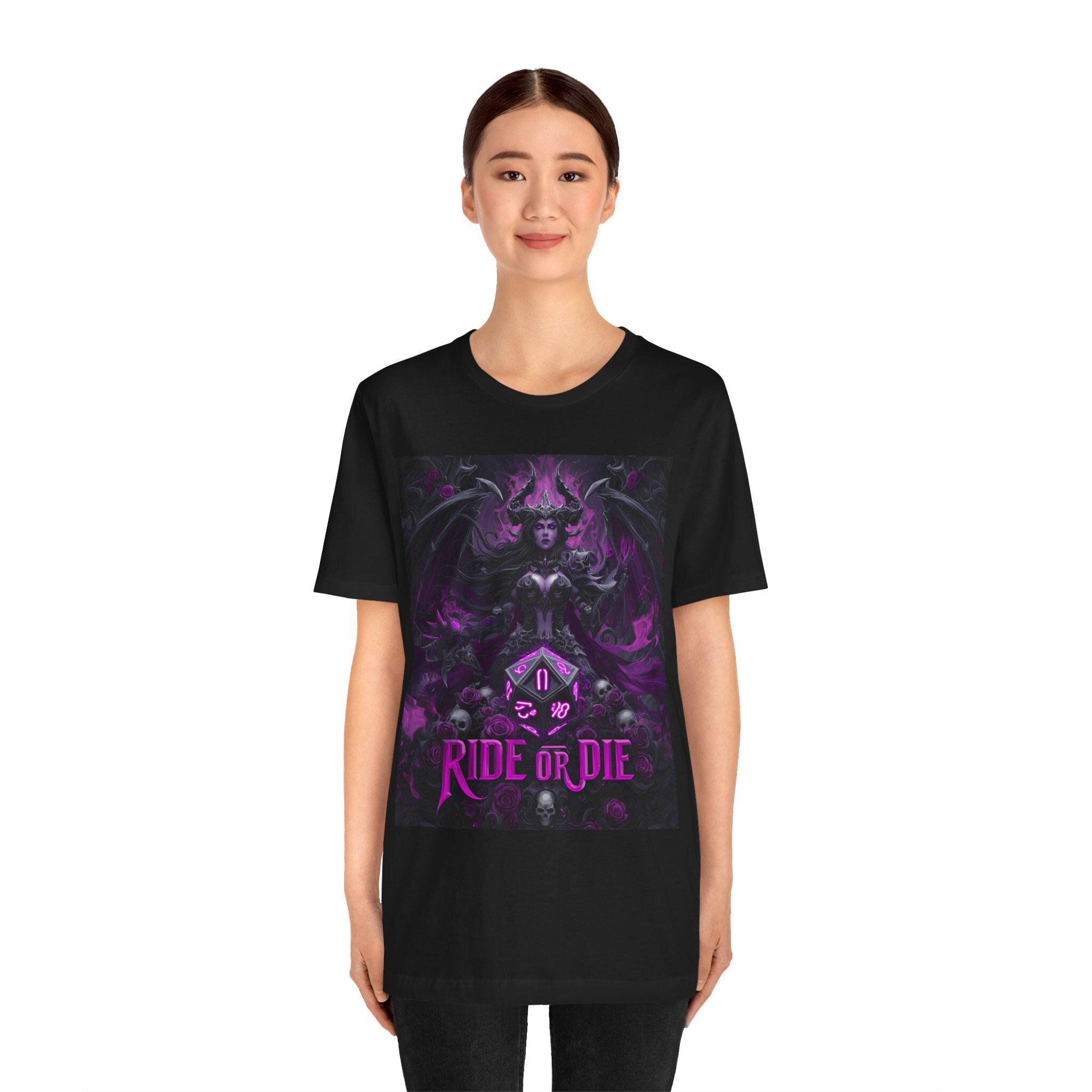 A bold dark-fantasy tee made for DnD adventurers, dungeon masters, and anyone who loves dramatic gothic art. The design features a powerful demoness surrounded by arcane detailing, skull accents, and a large D20 at the center — finished with the phrase “RIDE OR DIE” below for an unmistakably fierce TTRPG vibe. Rich purples, deep shadows, and fantasy-inspired textures give this shirt an 80s boho-metal aesthetic that stands out at game night, conventions, festivals, or casual everyday wear.