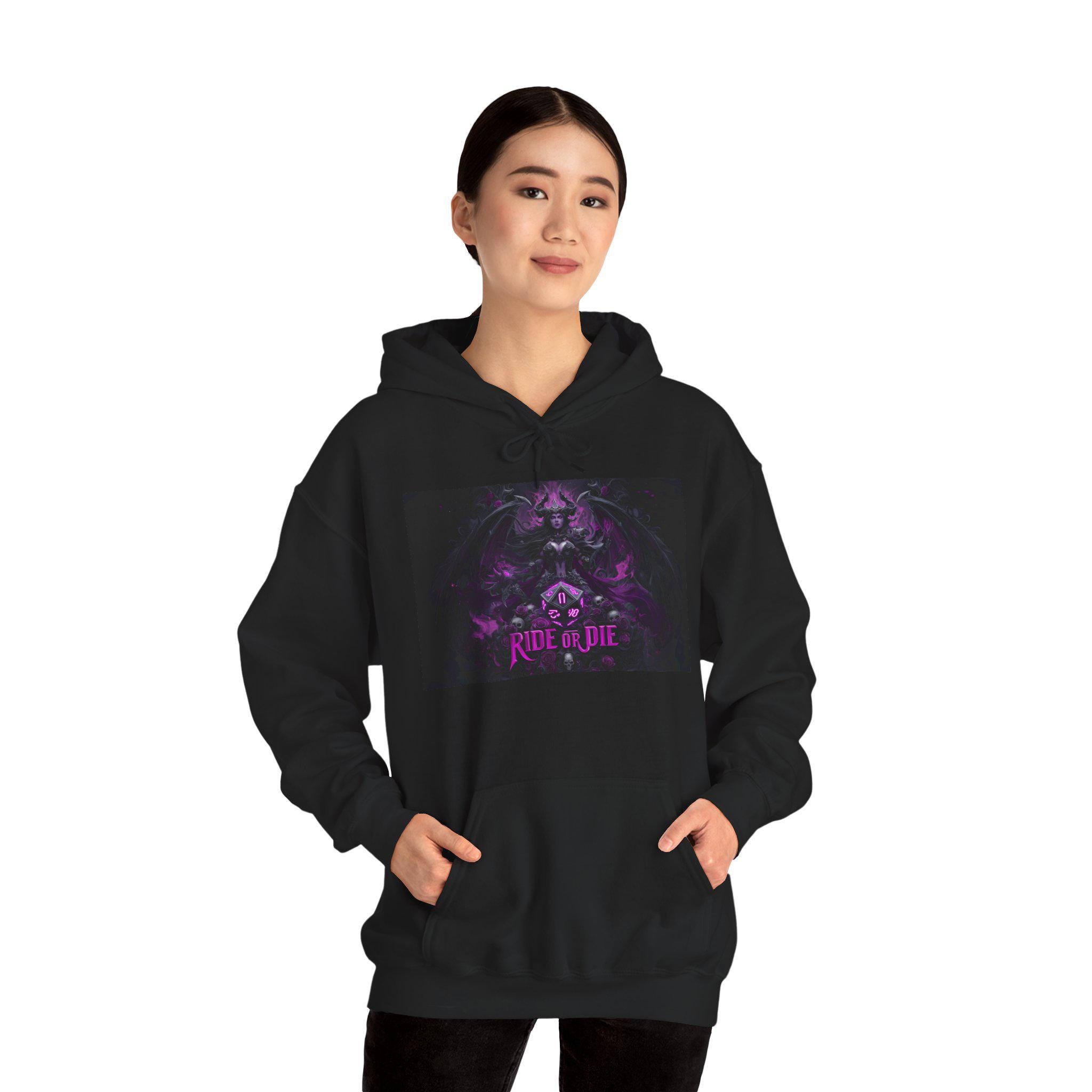 TStep into your next campaign—or your next night out—with a hoodie built for dark-fantasy lovers, DnD players, and anyone who thrives in moody, atmospheric style. This Ride or Die Demoness Skull DnD Gaming Hoodie features a bold purple fantasy graphic inspired by arcane aesthetics, dragons, and gothic TTRPG artwork. The rich colors stand out against the deep-black fleece, creating a cinematic look that hits hard up close while staying mysterious from a distance.