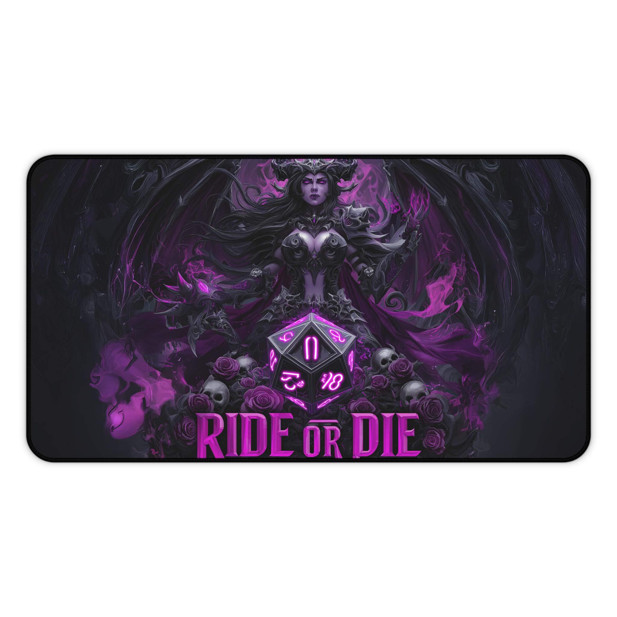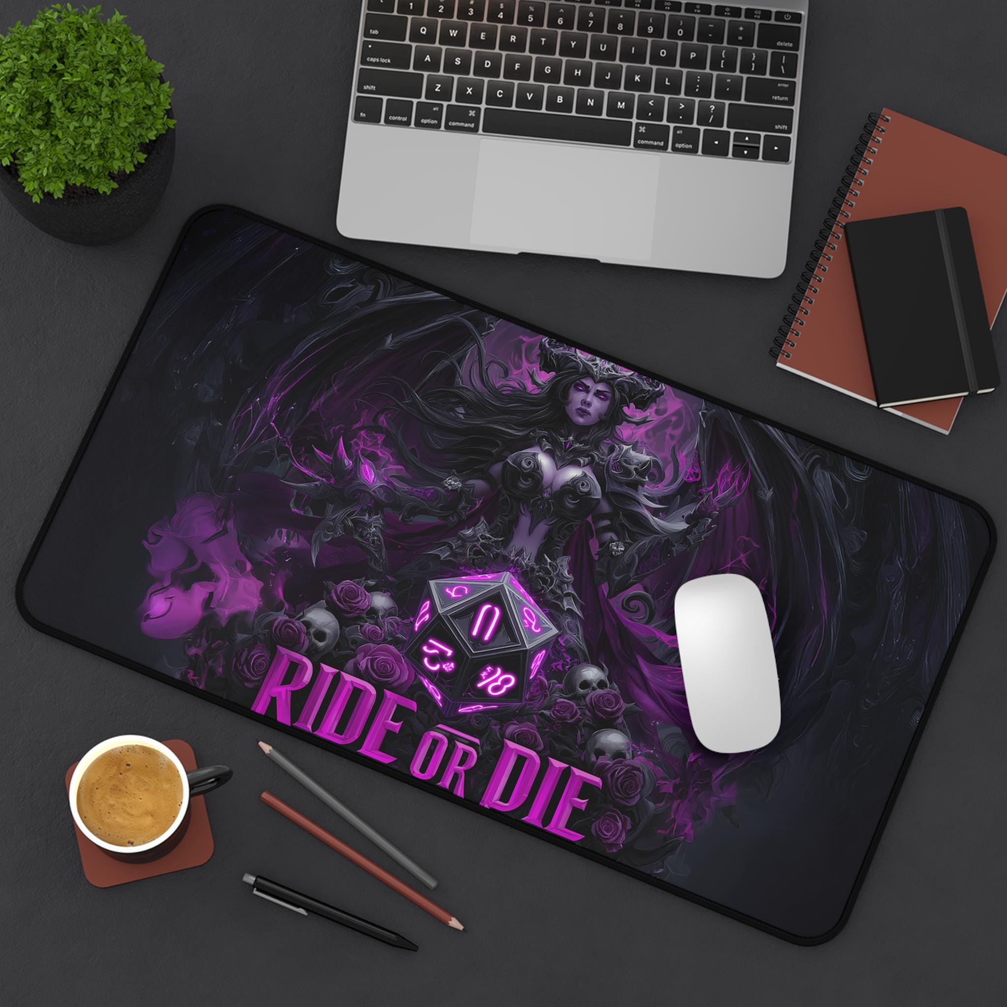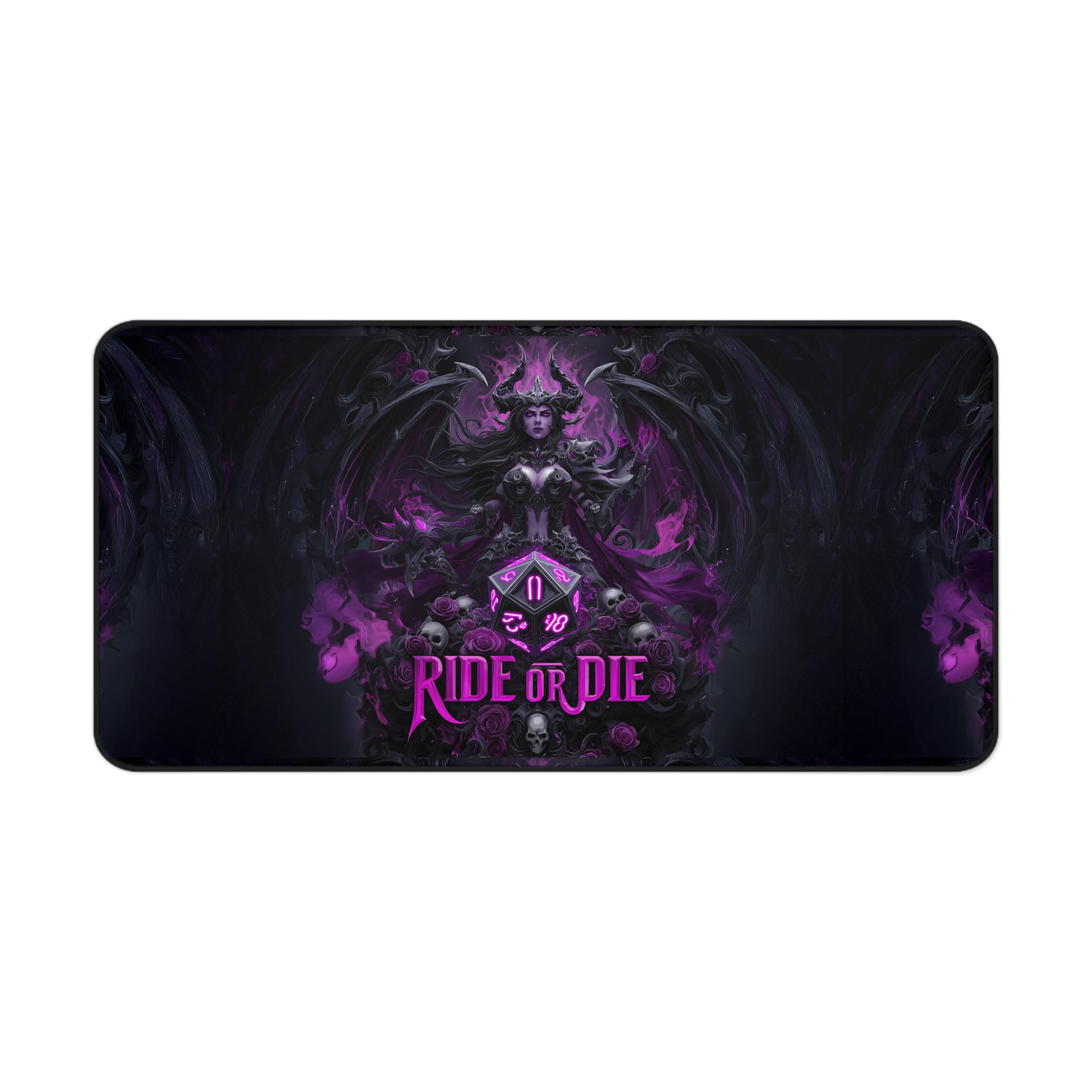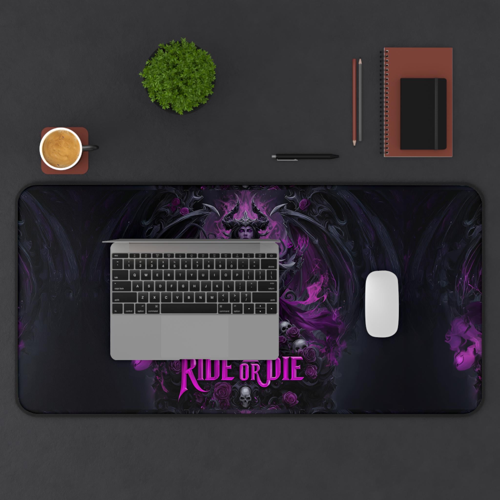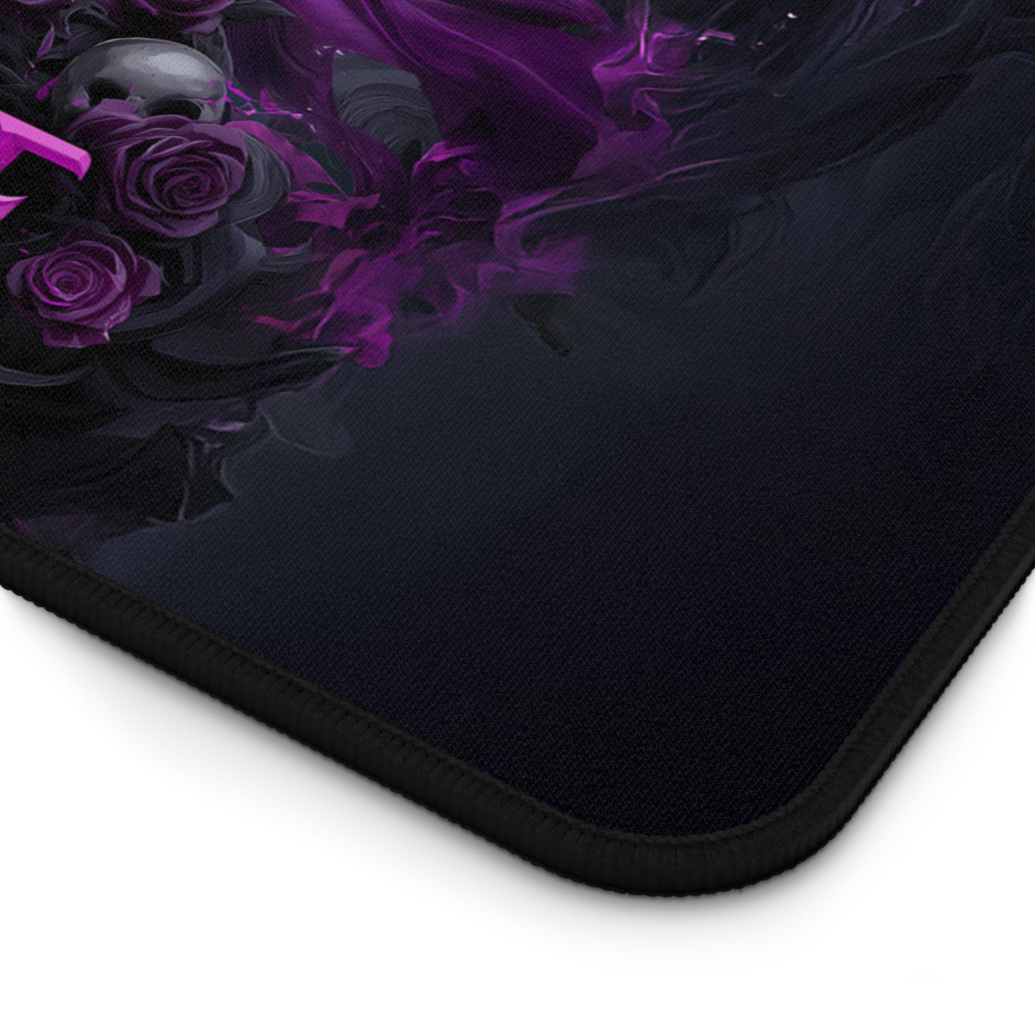 This neoprene desk mat brings bold, gothic energy to your workspace. Dark purples and inky blacks swirl around a fierce, otherworldly figure and skull motifs, setting a dramatic scene that keeps your desk feeling personal and charged. The soft, smooth surface supports precise mouse movement, while the stitched edges and anti-slip backing keep everything in place through long gaming sessions, late-night design work, or focused crafting. It’s the kind of desk piece that sparks mood and momentum whenever you sit down to create.
