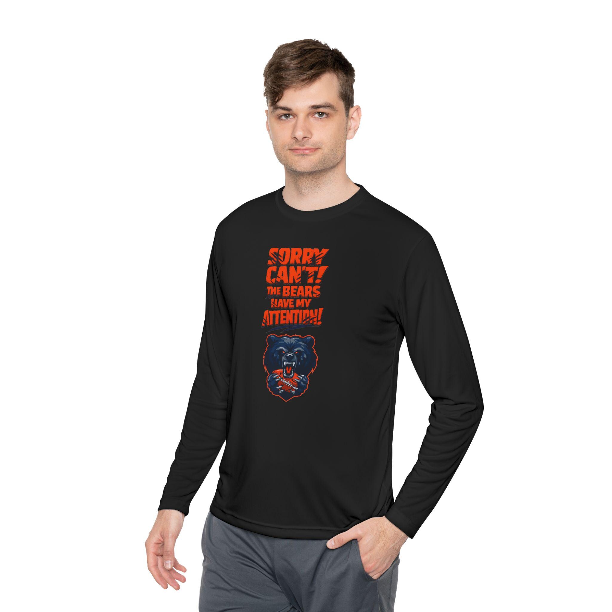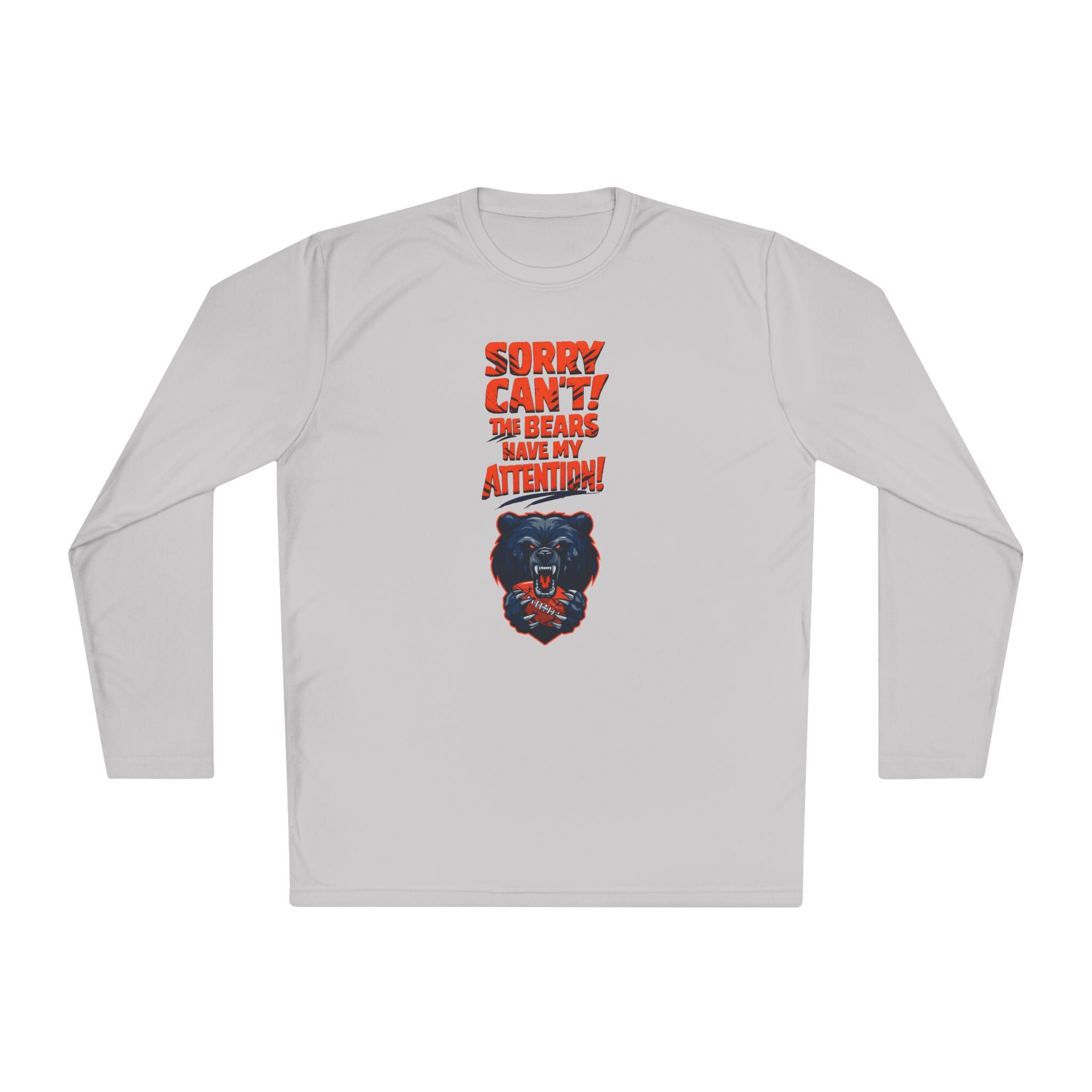 The front features a stylized bear-inspired graphic and the playful phrase “Sorry Can’t — Bears Got My Attention,” giving the shirt a gritty, urban edge without using any official team marks. Crisp DTF printing keeps the artwork sharp while staying flexible on the fabric, and the athletic cut offers a clean, modern fit. With its quick-dry performance and tear-away label, this is the kind of shirt that becomes a go-to for fans who live and breathe football.