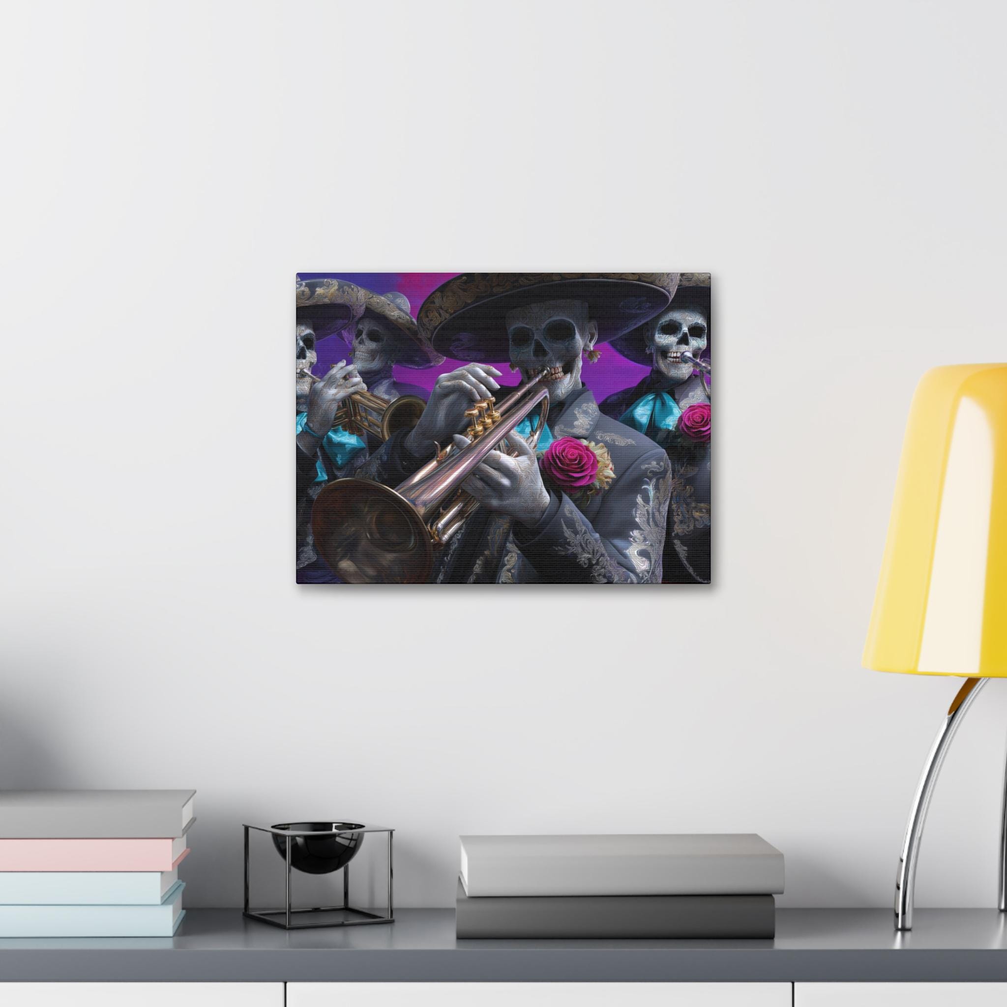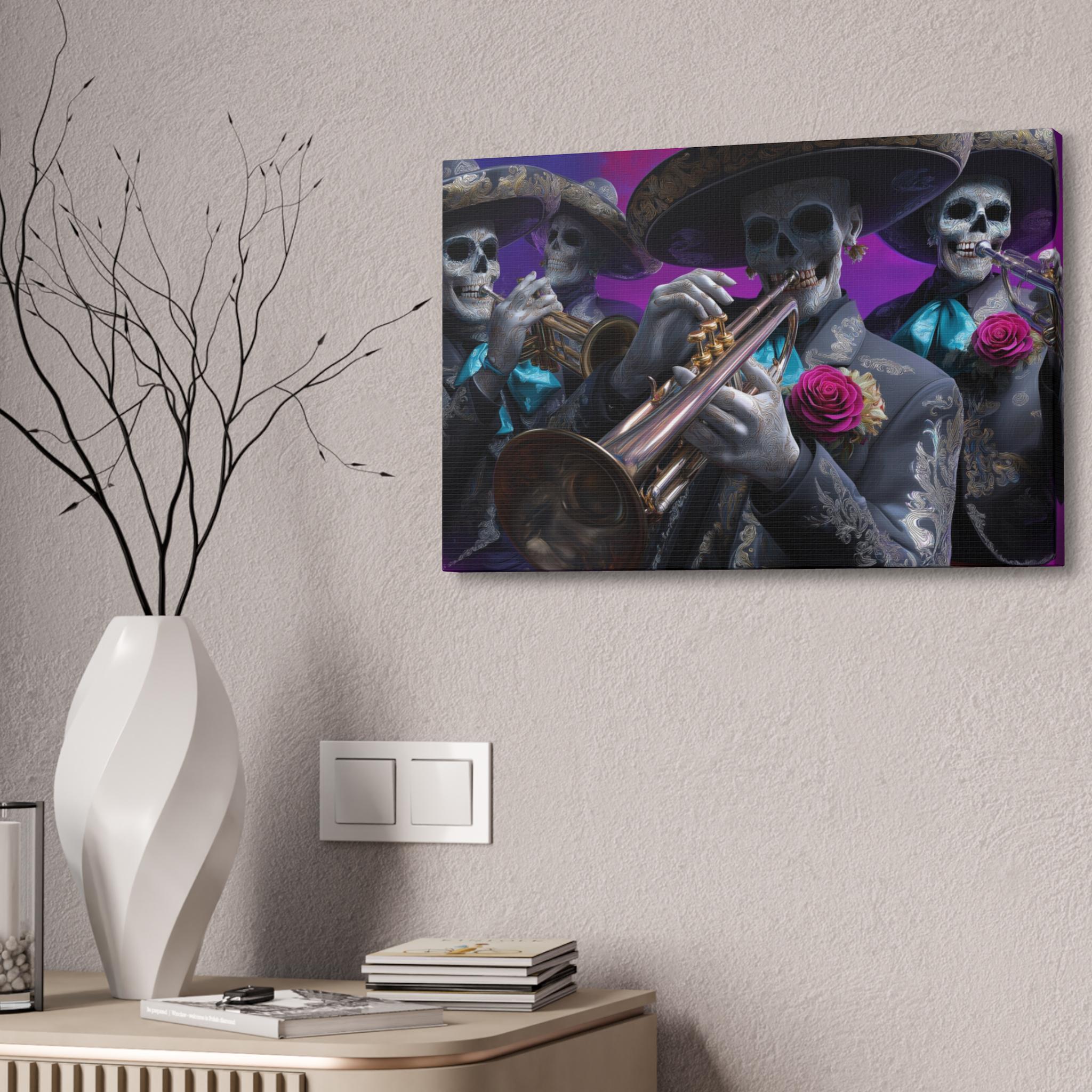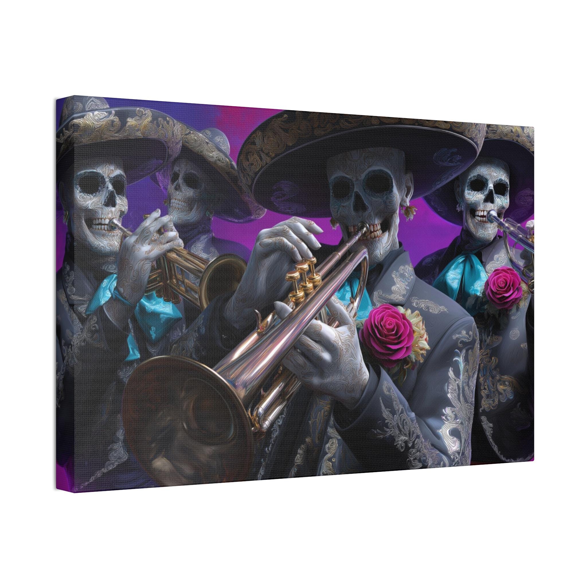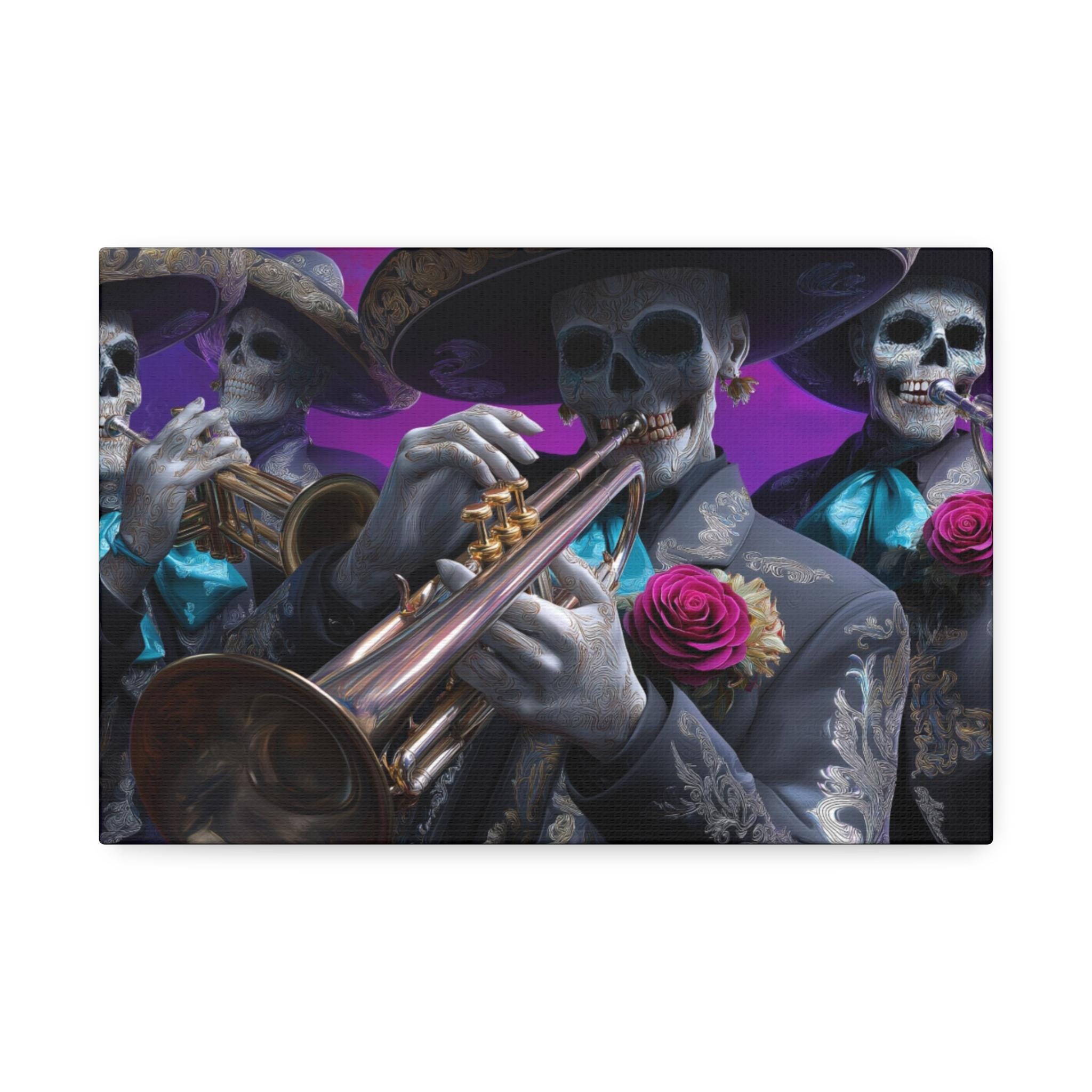 Bring rhythm, culture, and attitude to your walls with this striking mariachi skull canvas inspired by Día de los Muertos. Featuring a full mariachi band rendered as expressive sugar skull musicians, this artwork captures the spirit of music, celebration, and remembrance in a bold, modern way. Ornate charro suits, gleaming brass instruments, and vivid rose accents stand out against a rich, painterly background, creating a cinematic composition that feels alive with movement and sound.