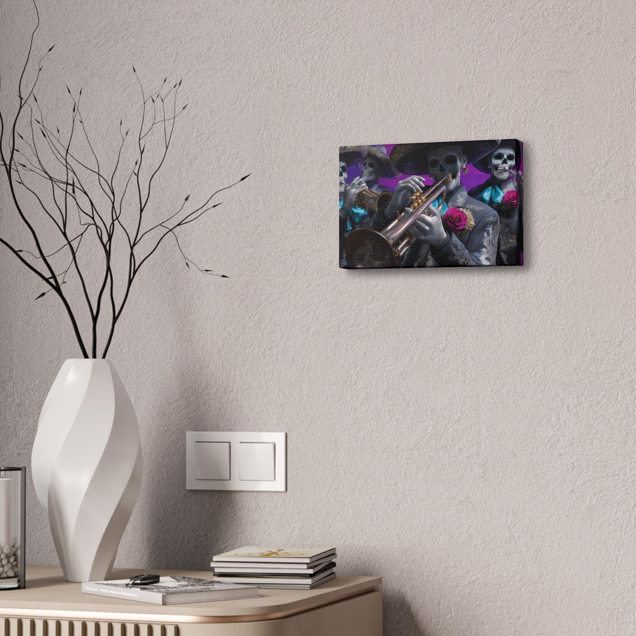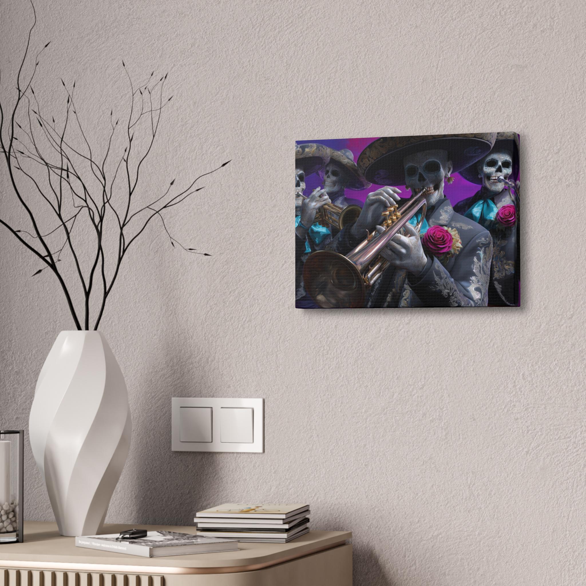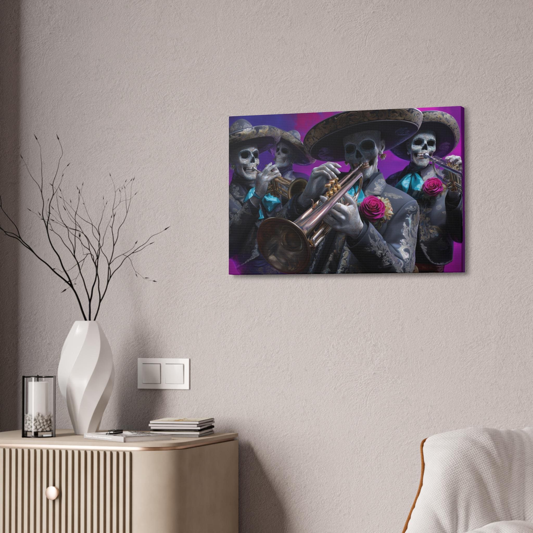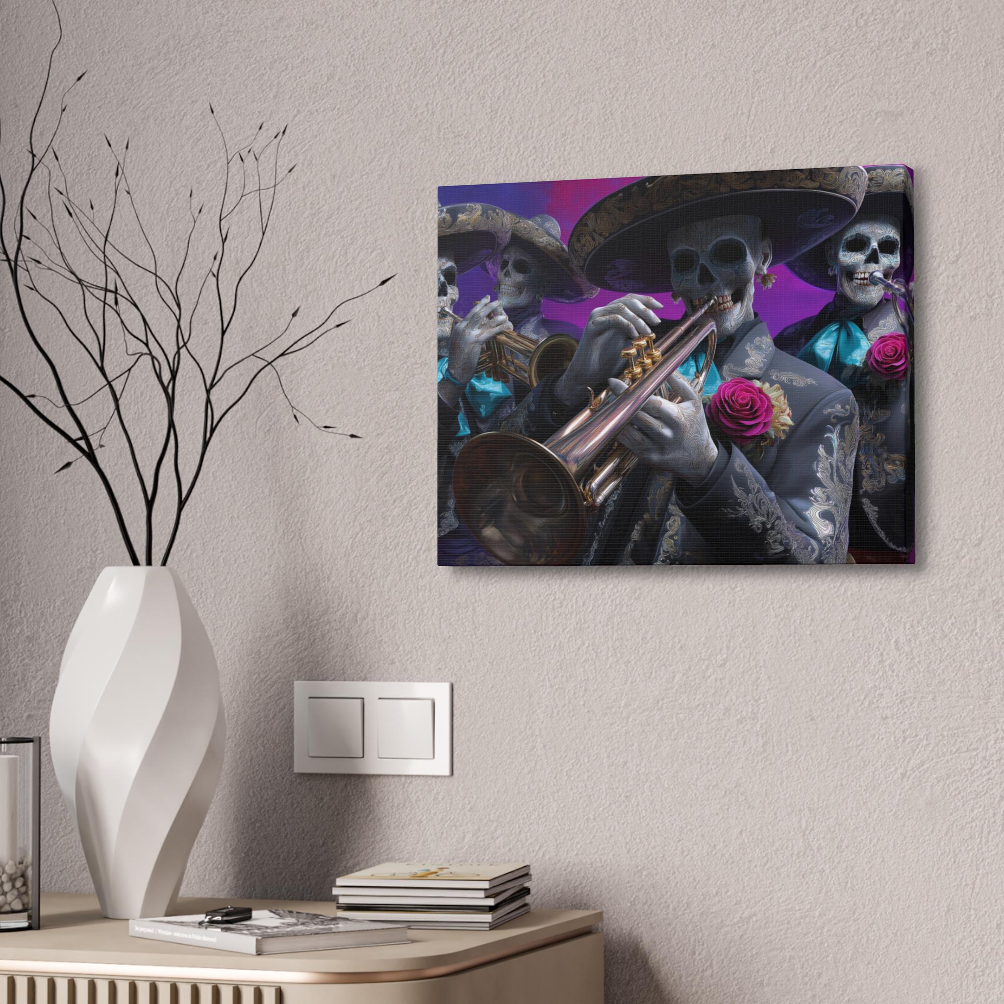 Bring rhythm, culture, and attitude to your walls with this striking mariachi skull canvas inspired by Día de los Muertos. Featuring a full mariachi band rendered as expressive sugar skull musicians, this artwork captures the spirit of music, celebration, and remembrance in a bold, modern way. Ornate charro suits, gleaming brass instruments, and vivid rose accents stand out against a rich, painterly background, creating a cinematic composition that feels alive with movement and sound.