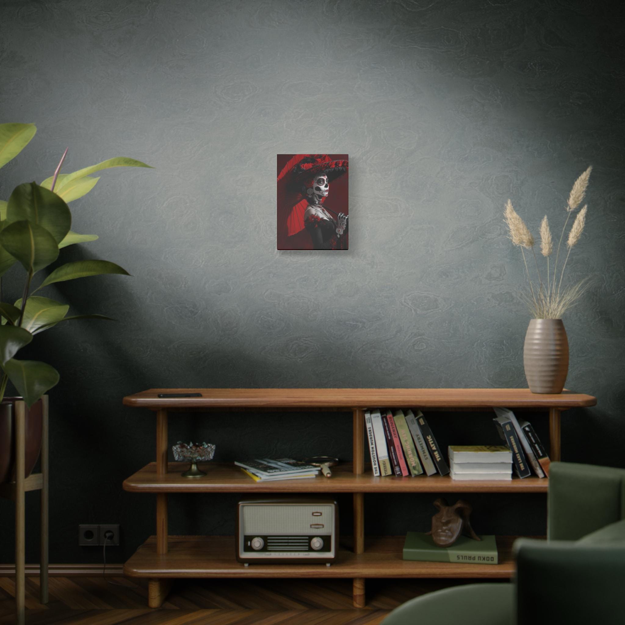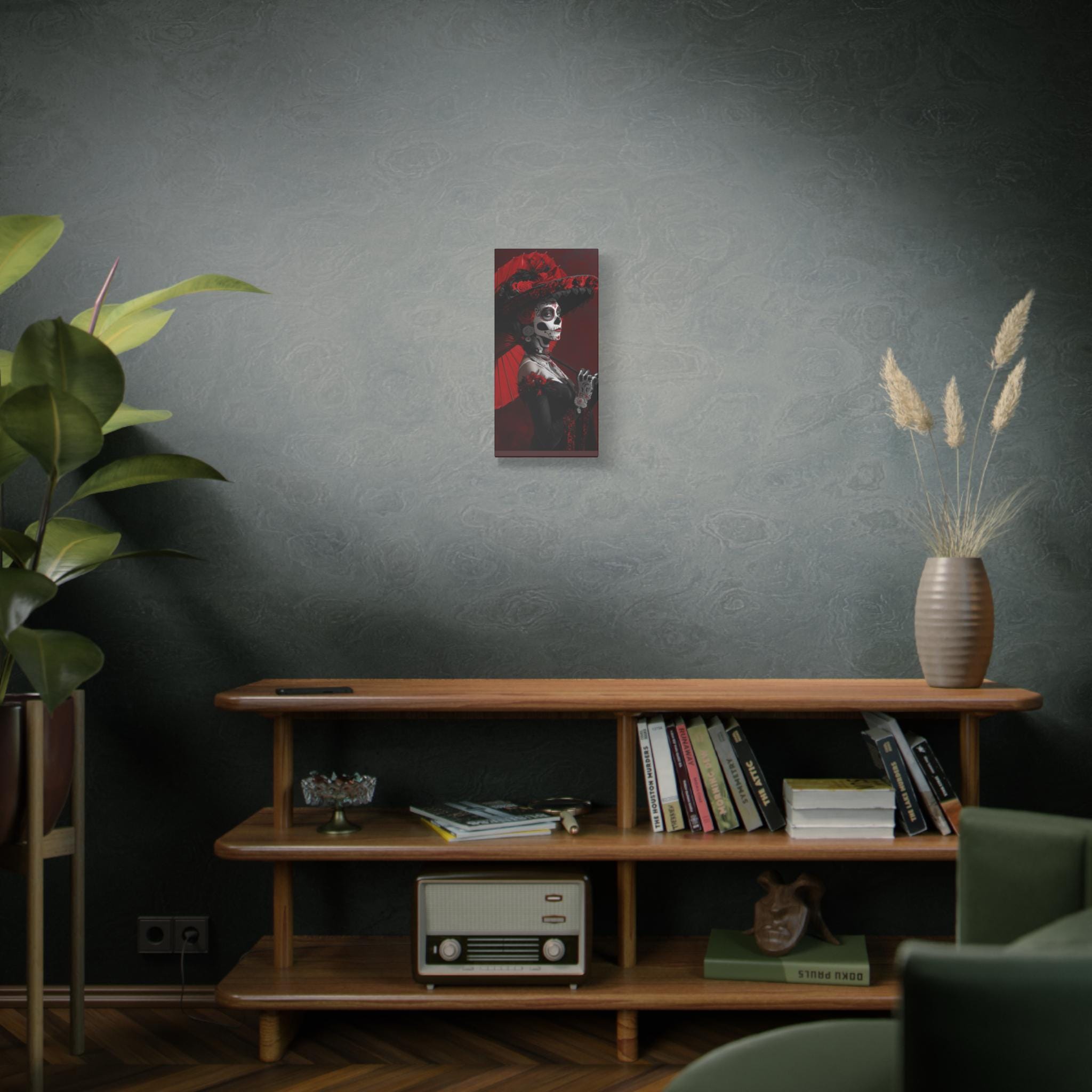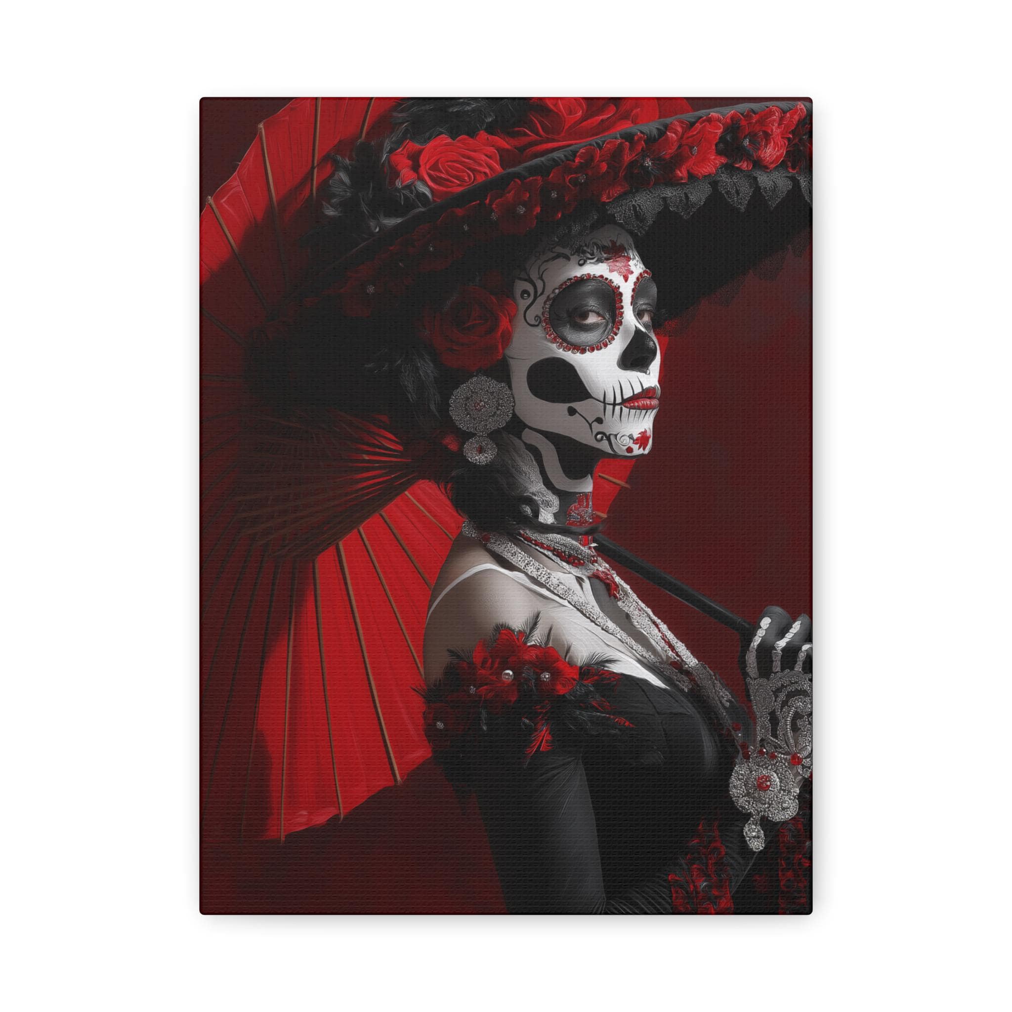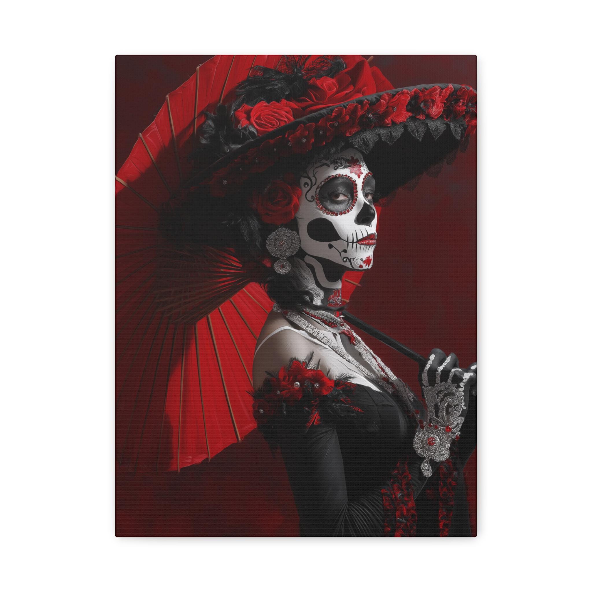 This striking matte canvas features a hauntingly elegant sugar skull portrait, layered with deep scarlet tones, inky shadows, and intricate calavera face paint. Delicate floral accents and lace-like details invite closer inspection, revealing a piece that feels ceremonial, theatrical, and deeply rooted in tradition. It carries the presence of an old-world procession — reverent, expressive, and impossible to ignore.