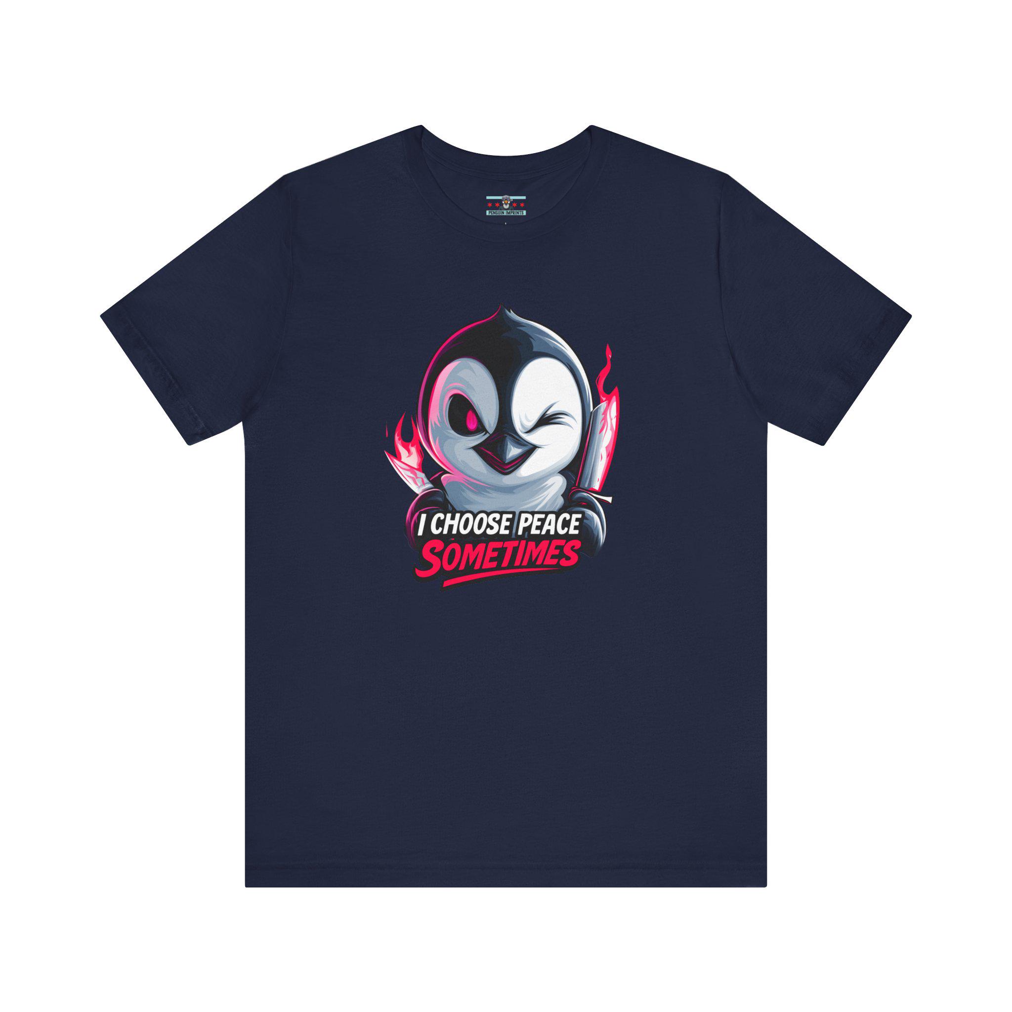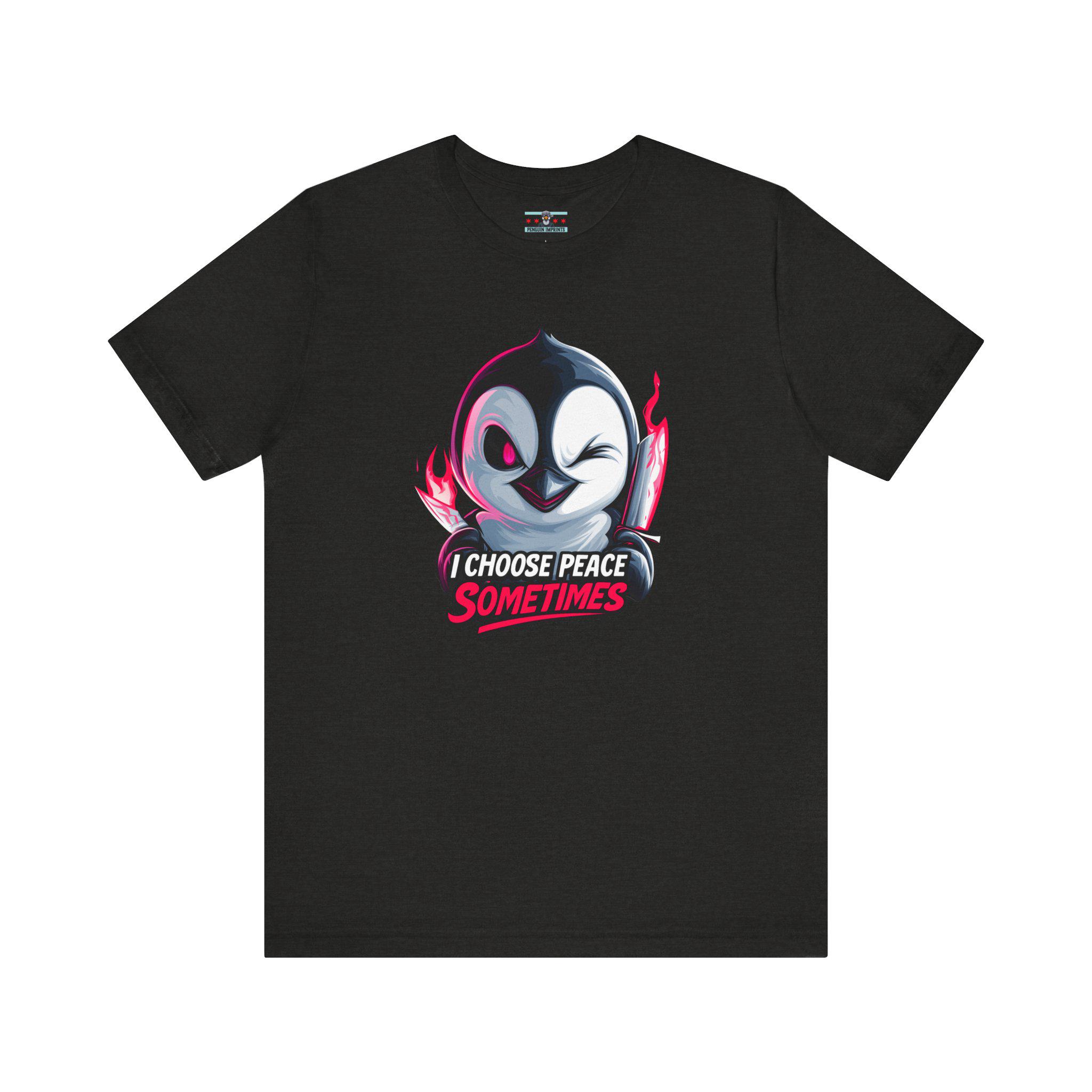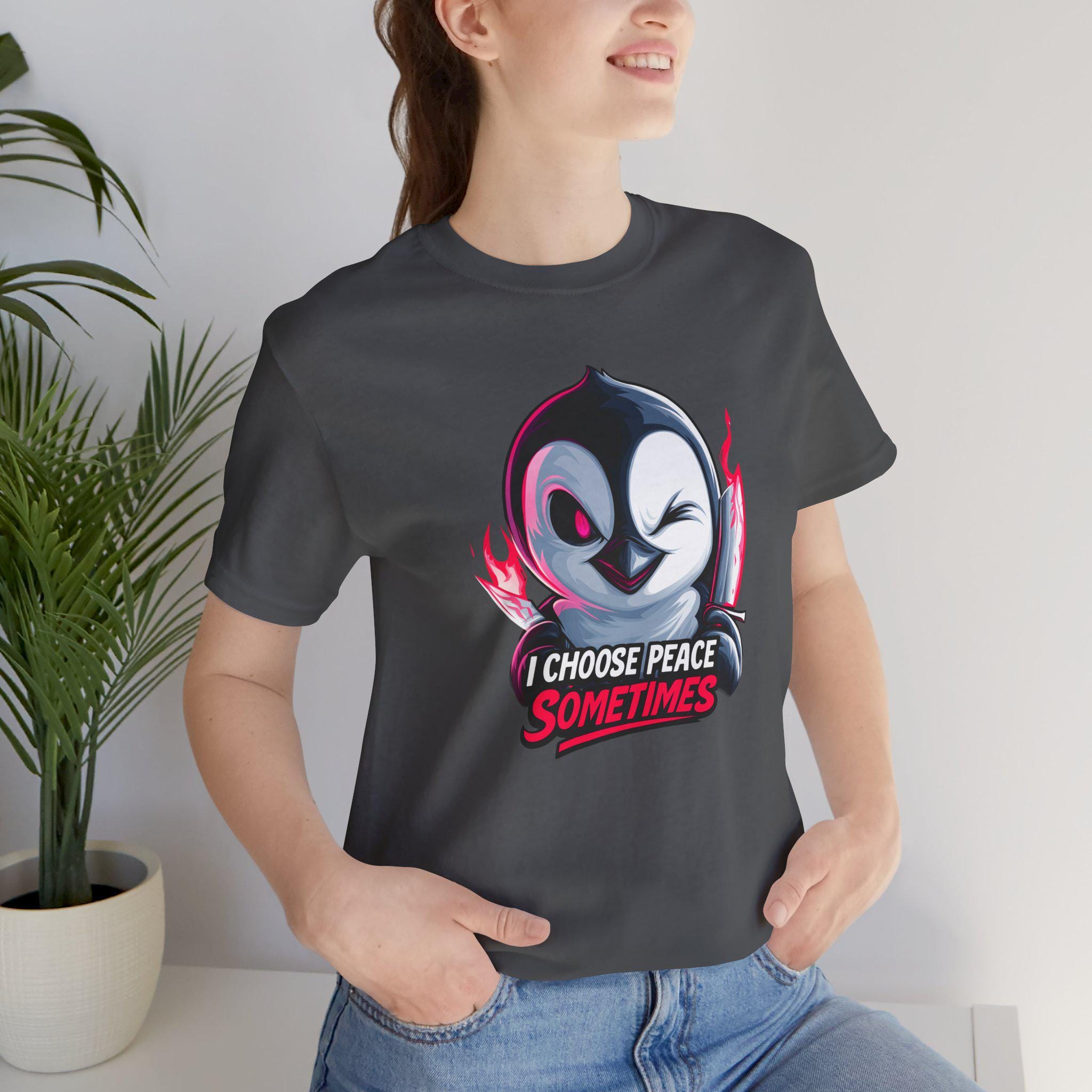Soft, breathable, and made to stand out — this unisex graphic tee delivers humor with just the right amount of edge. Front and center is a bold, neon-accented penguin illustration, flashing a confident wink above the phrase “I Choose Peace Sometimes.” It’s playful, a little unhinged, and instantly relatable.
