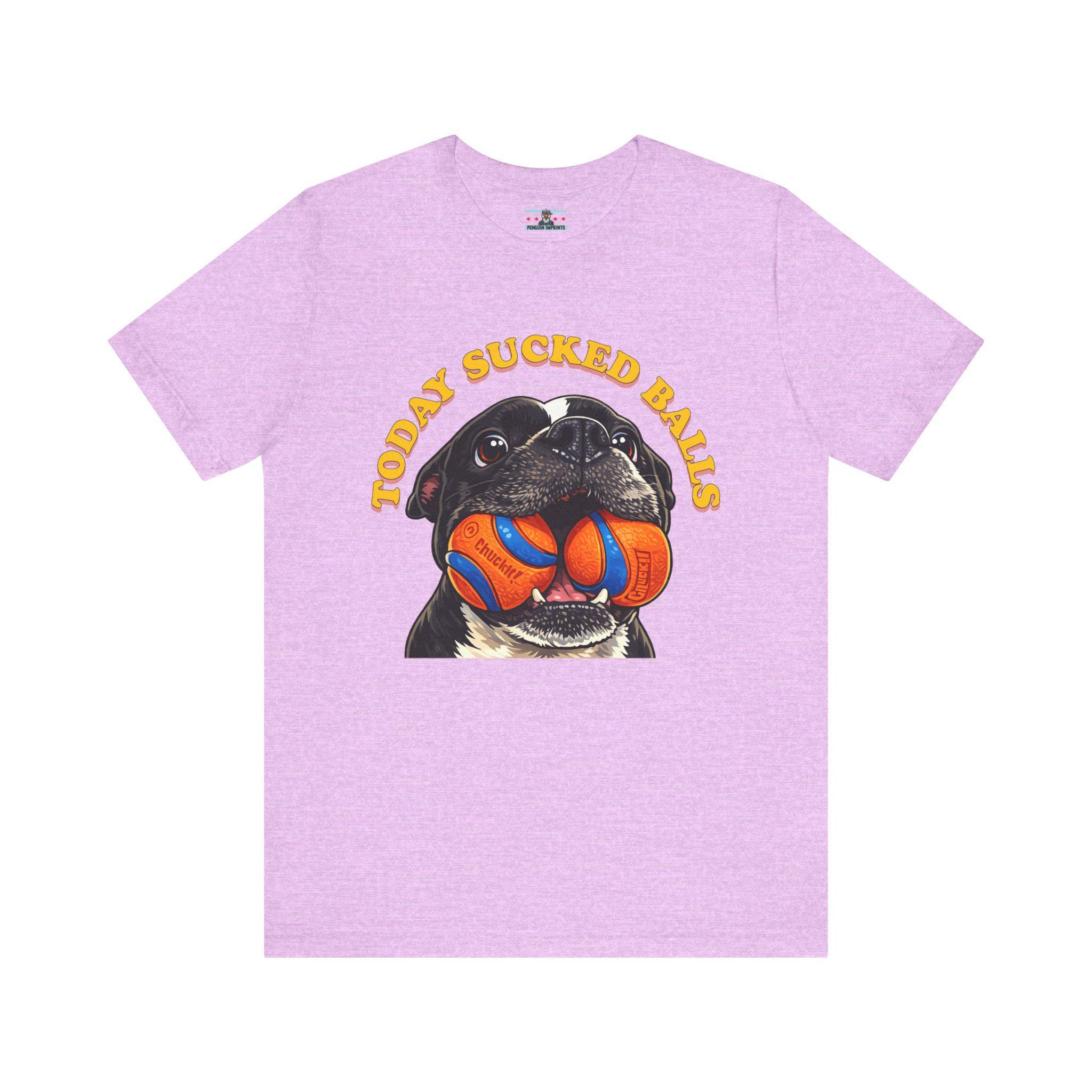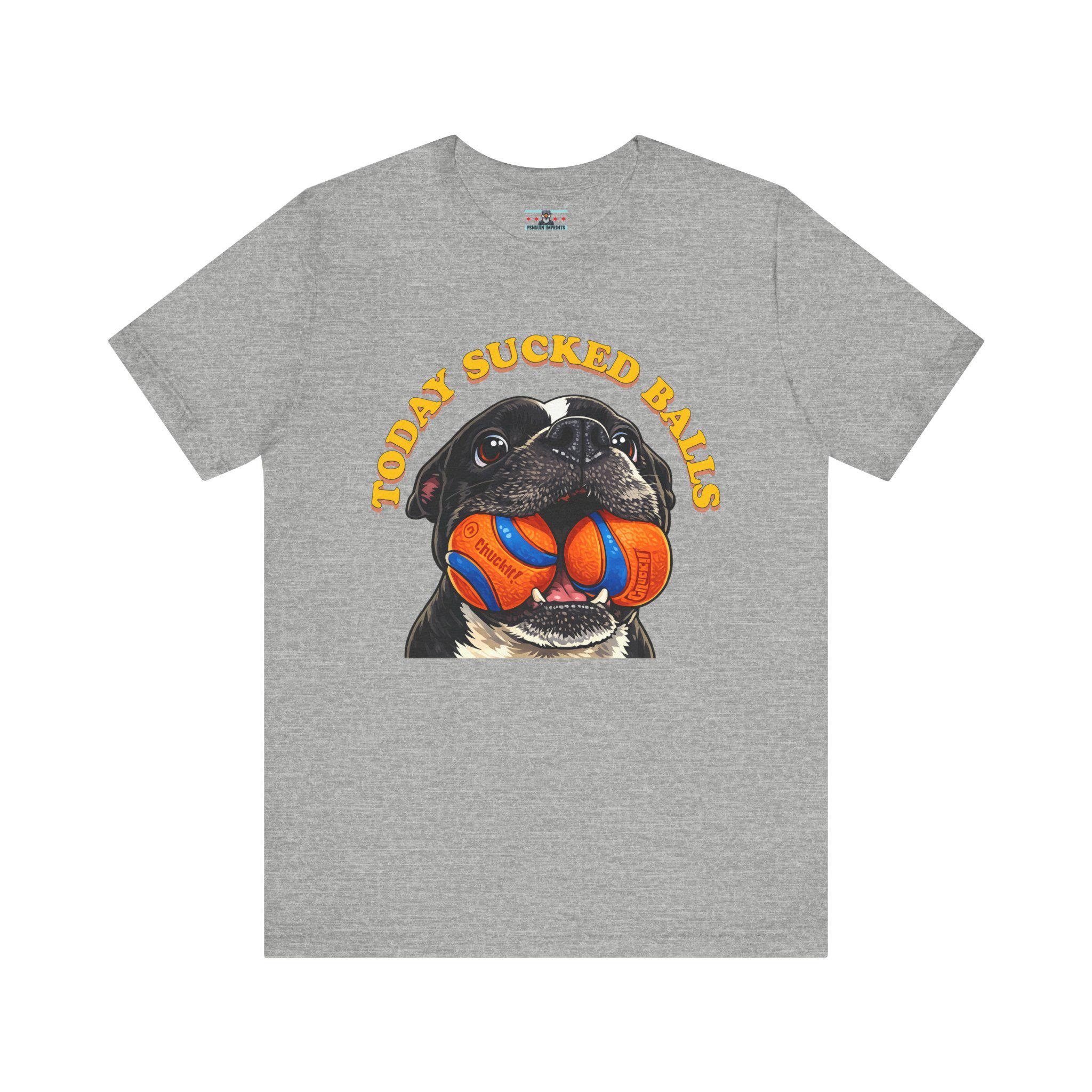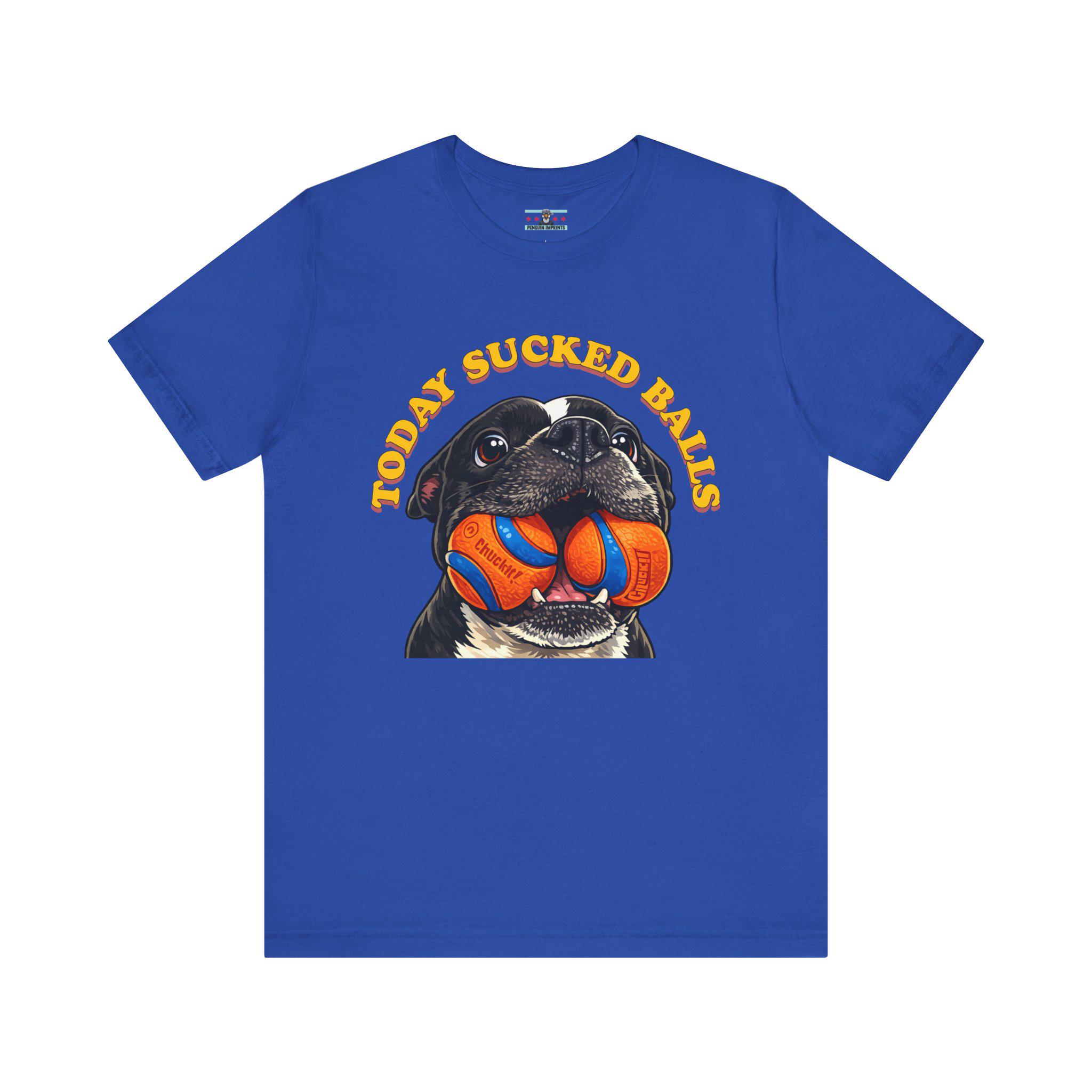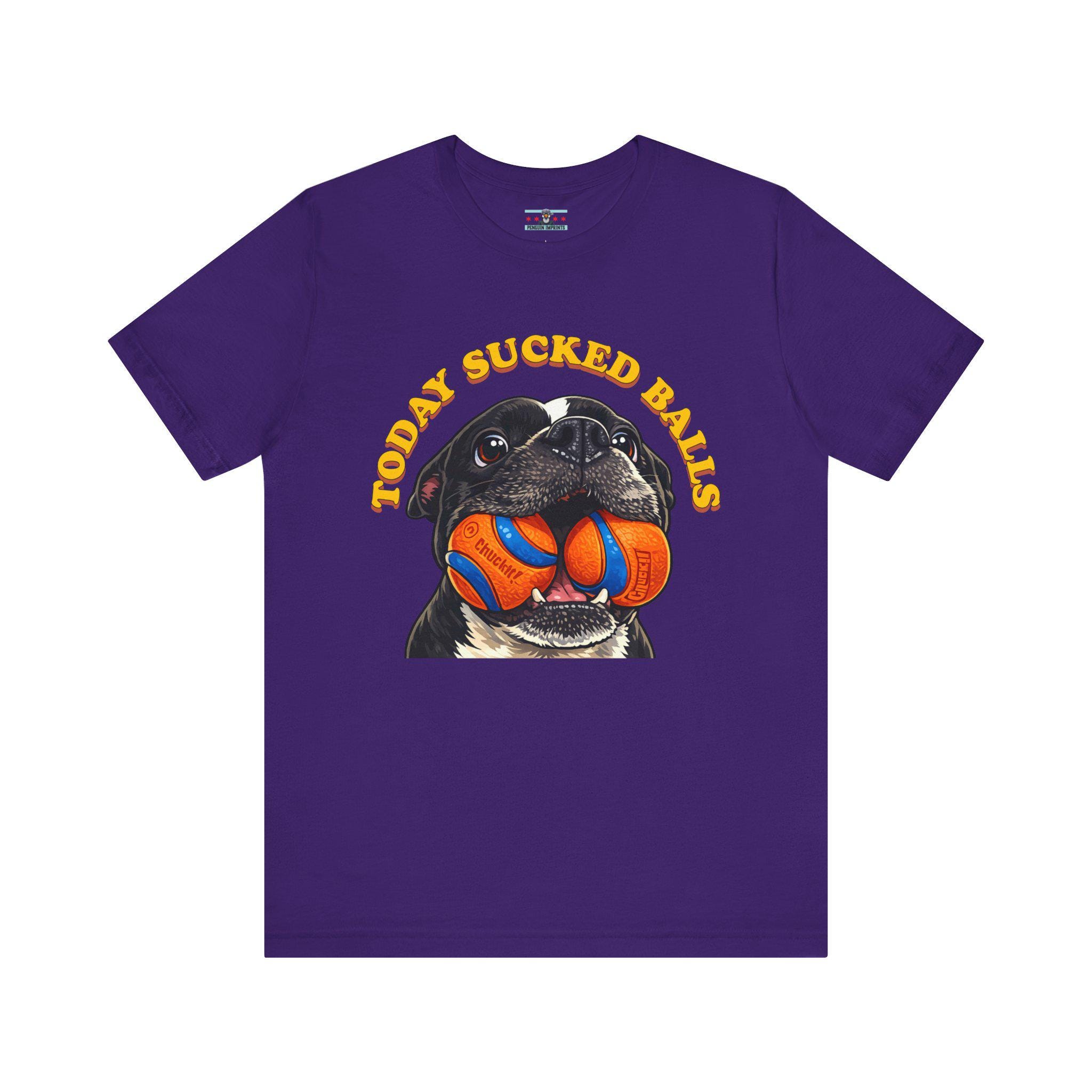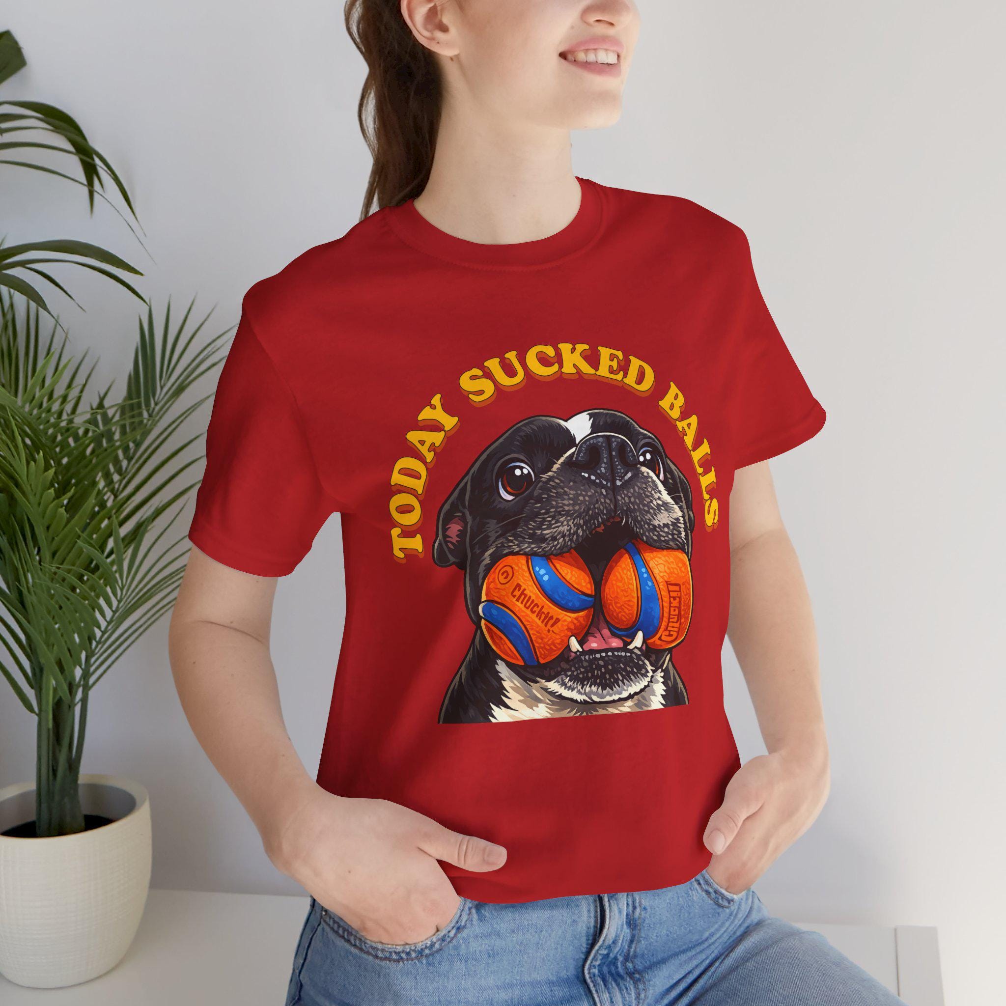 Inspired by our American Bulldog Max, this shirt captures that exact “nope, not today” energy we all feel when the world decides to be extra annoying. A bold, cartoon-style dog portrait takes center stage, proudly holding two bright orange-and-blue balls under vintage, curved lettering that says what you’re already thinking. It’s silly, loud, and unapologetically honest — just like Max.