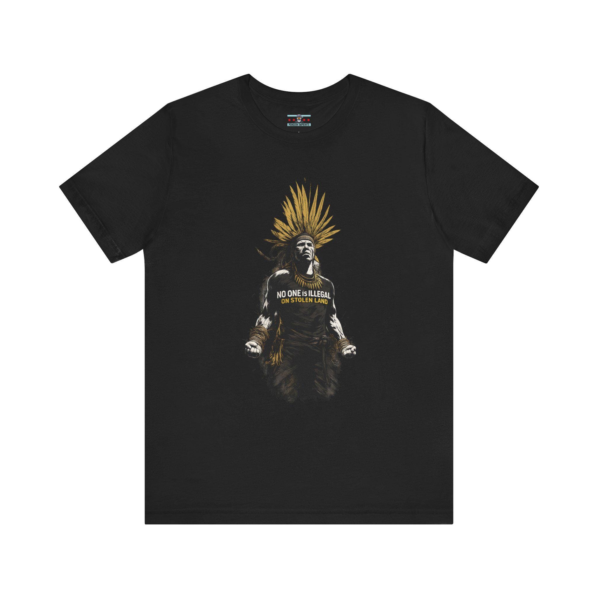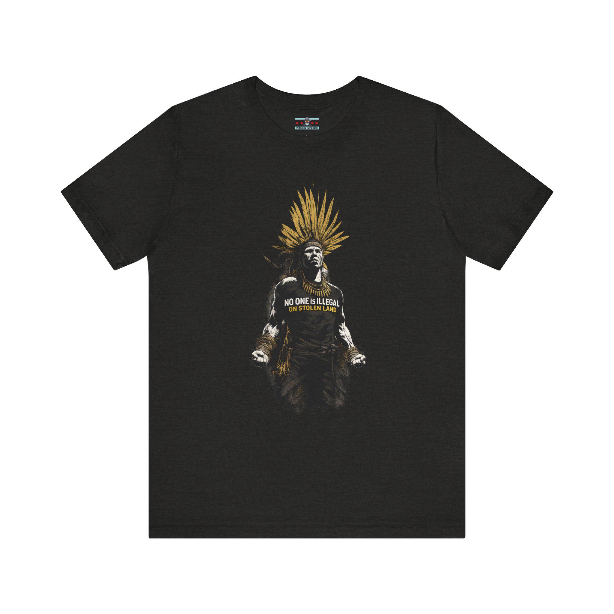 This lightweight jersey tee carries quiet confidence with a message that speaks without shouting. The front artwork features a powerful Indigenous figure wearing a feathered headdress, rendered in bold contrast with muted gold accents and deep charcoal tones. It reads less like a slogan and more like a statement — worn, not announced.
