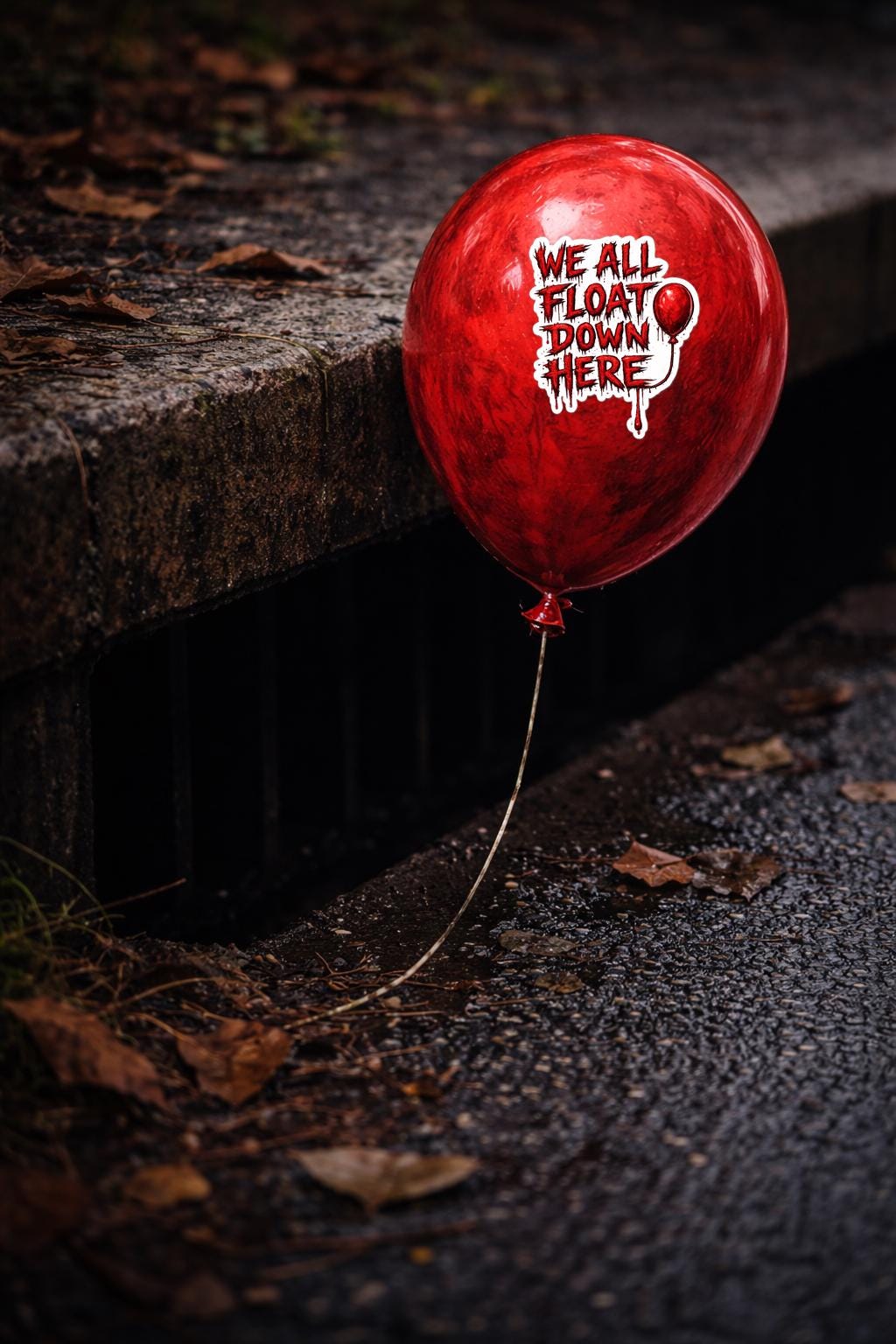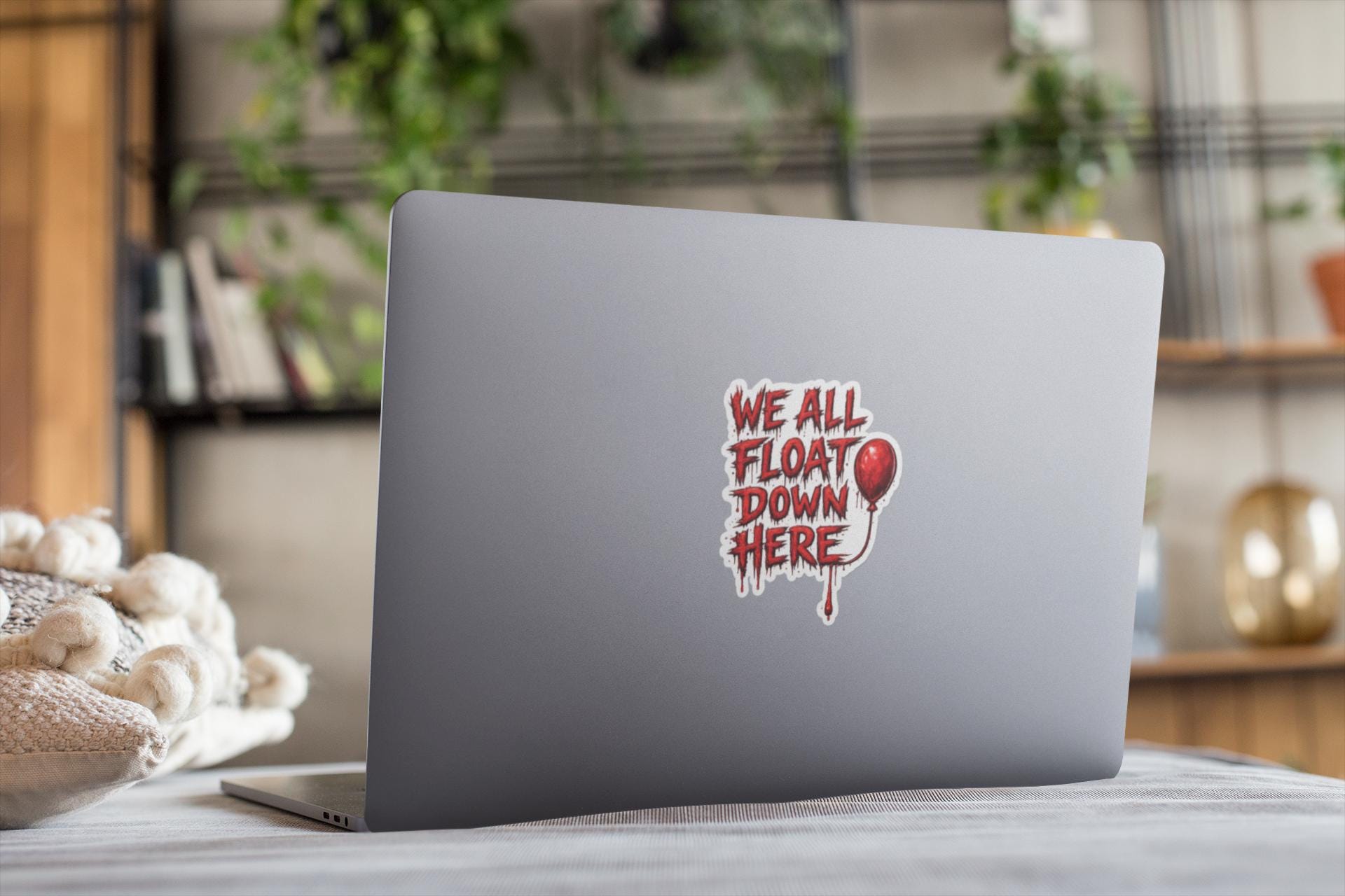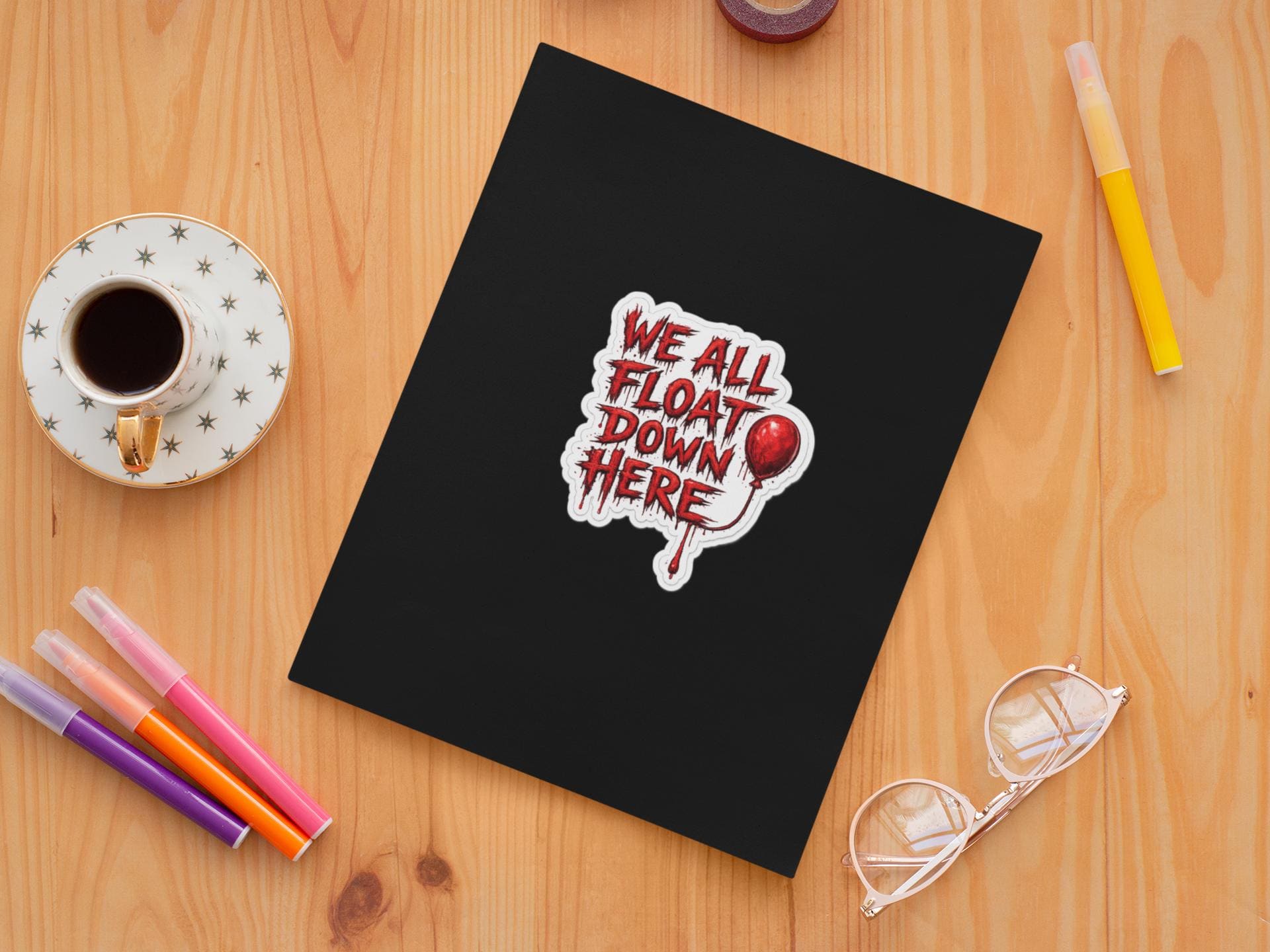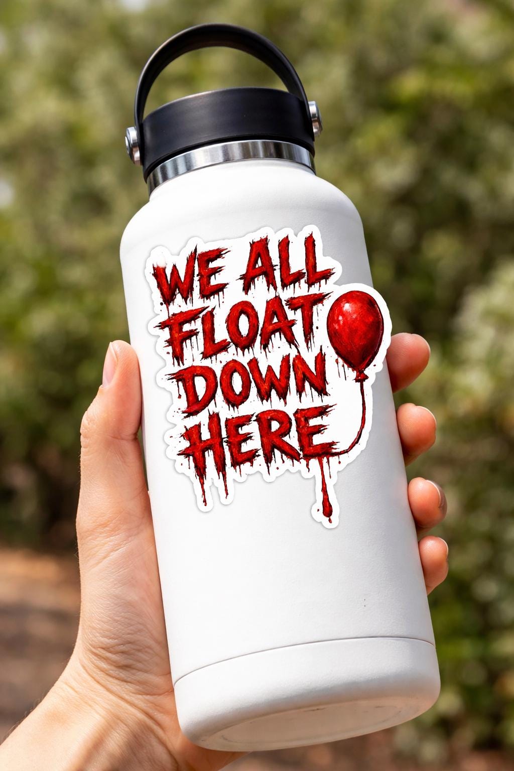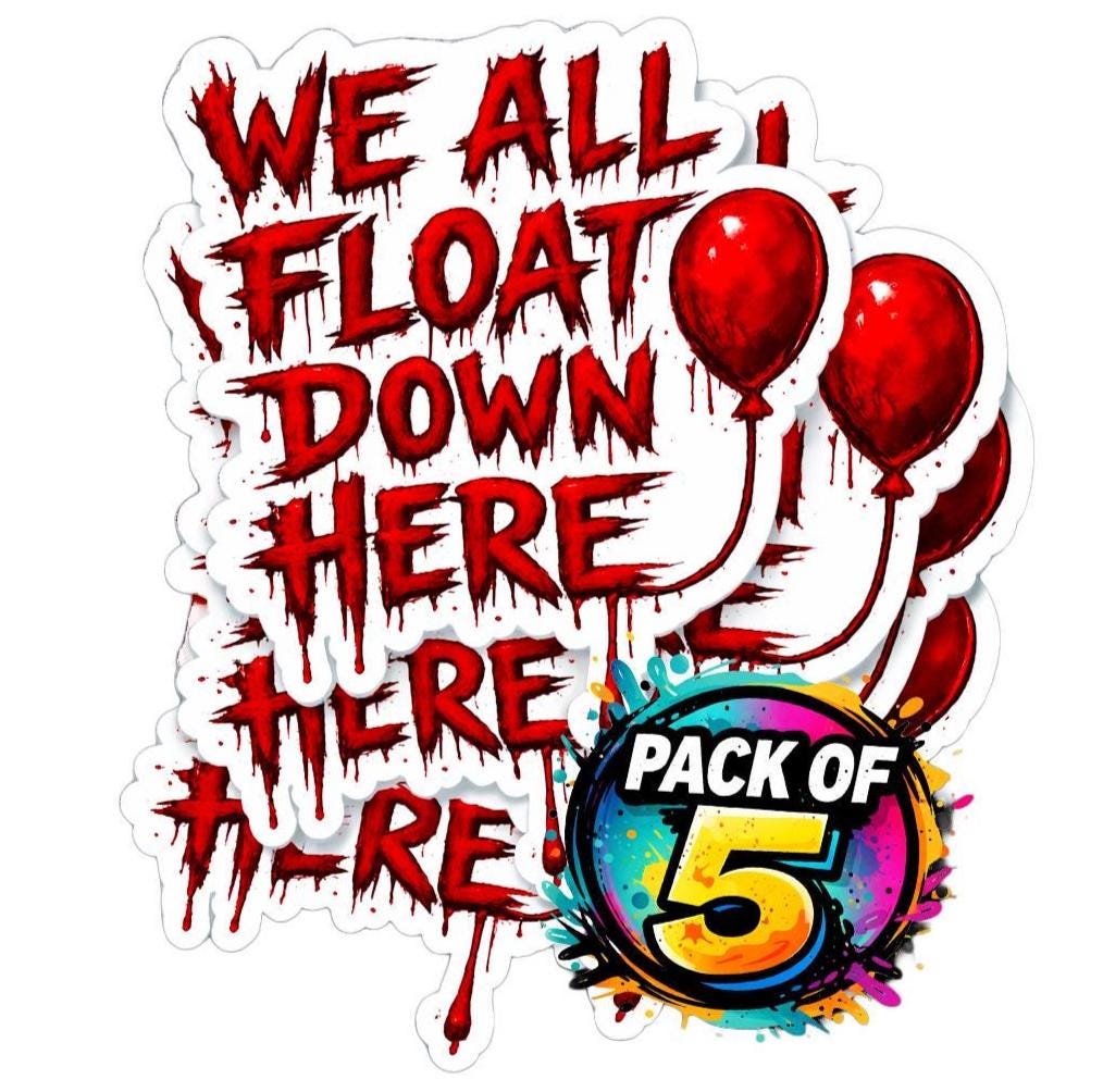 This “WE ALL FLOAT DOWN HERE” design is inspired by classic horror energy — bold, bloody lettering with that iconic red balloon detail that every horror fan recognizes instantly. Clean white sticker outline, no holes, high-resolution print — made to pop on laptops, water bottles, toolboxes, notebooks, or horror collections.