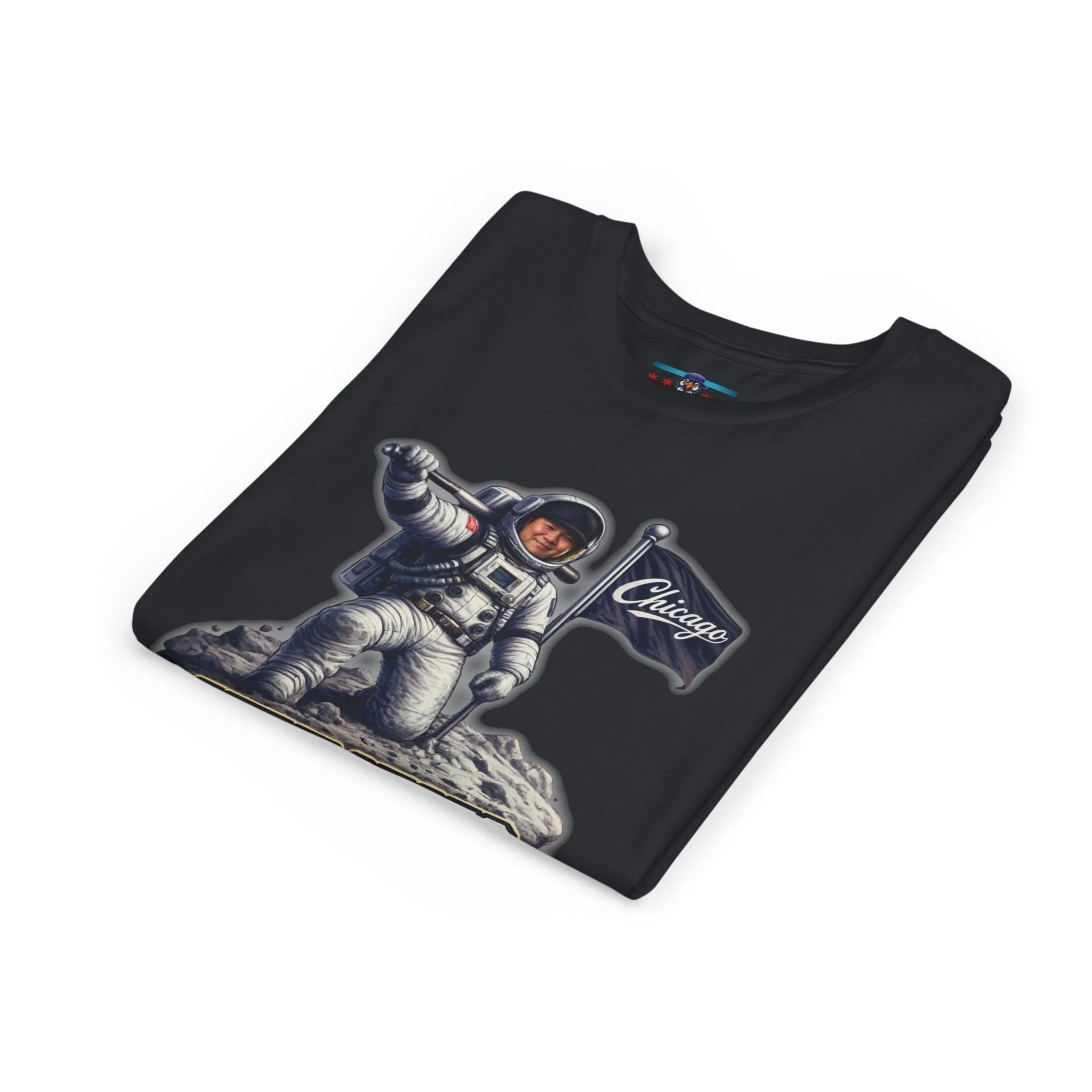 Mune Shots Tee brings cosmic energy to Chicago baseball culture. Designed as a tribute to towering home runs and highlight-reel swings, this graphic blends vintage black-and-white grit with a retro space-era edge.